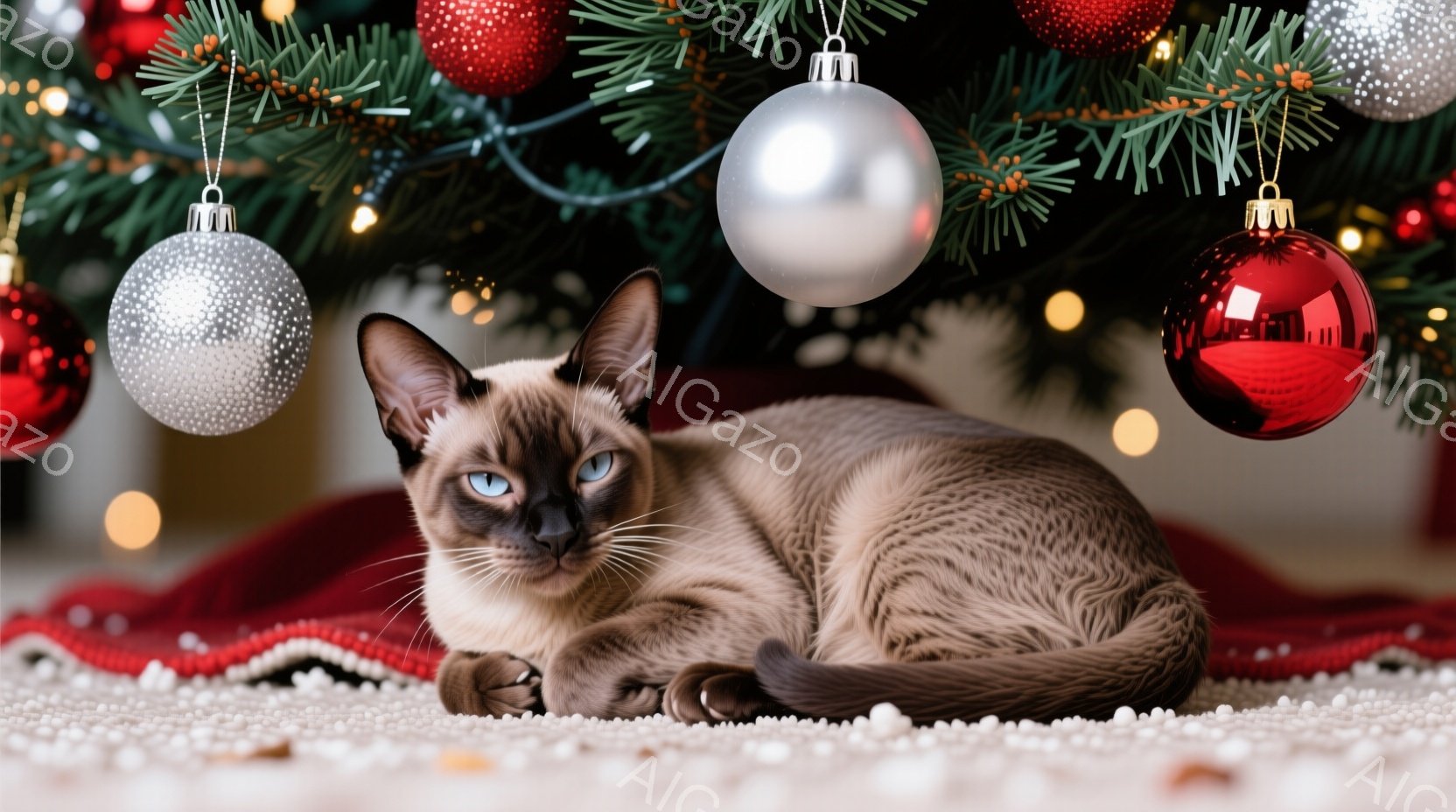 シーマーズ猫がクリスマスツリーの下、赤い敷物の上に丸まって座っています。猫は青い目をしており、毛並みはクリーム色と濃い茶色のコントラストが美しいです。背景には緑のクリスマスツリーが飾られ、赤いオーナメントが散りばめられ、全体的に温かく、お祝いの雰囲気です。