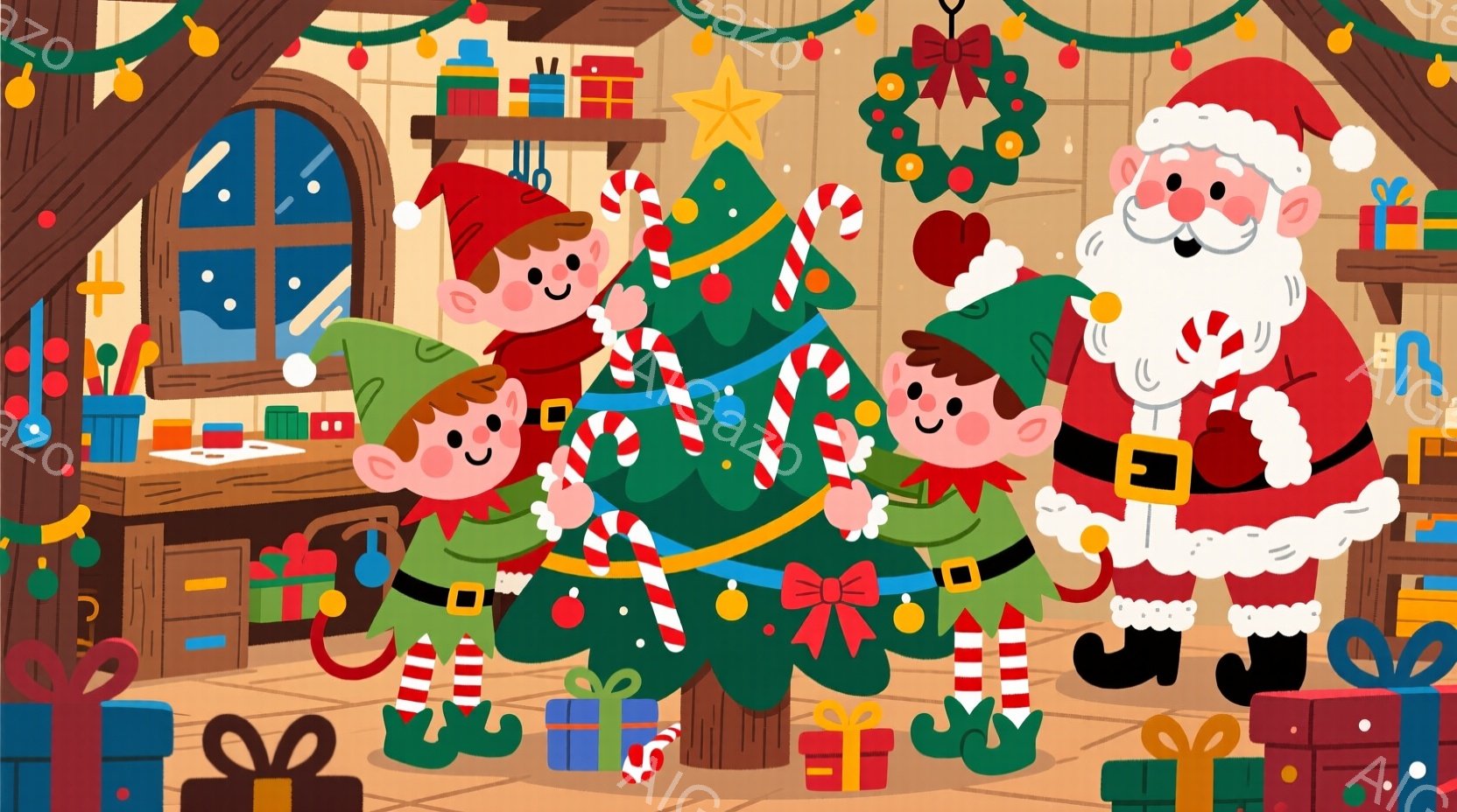 クリスマスの飾り付けをしている様子を描いています。サンタクロースと二人のエルフがクリスマスツリーの周りで踊るように輪になっており、皆笑顔で楽しんでいます。背景には暖炉、プレゼント、そしてクリスマスの飾り付けが散りばめられ、温かく幸せな雰囲気が漂っています。