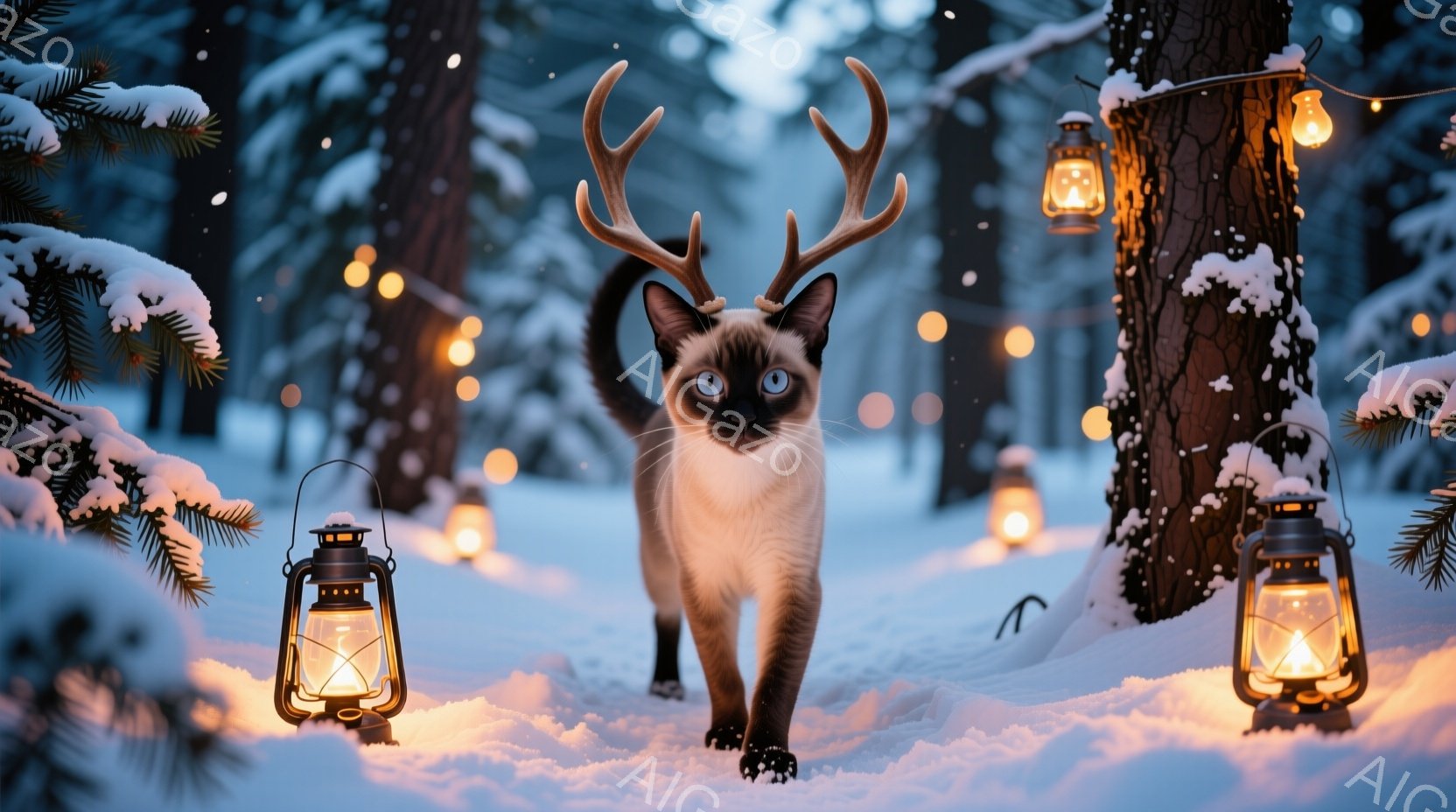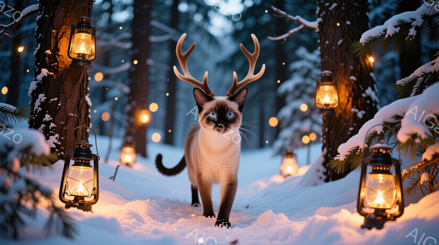 白い雪に覆われた森の中を、角のような飾りをつけたシャム猫が歩いている。猫は真っ直ぐ前を見据え、凛とした表情で、冬の夜の幻想的な雰囲気を醸し出している。背景には、点灯されたランタンが並び、雪景色と暖かな光が美しいコントラストを生み出している。