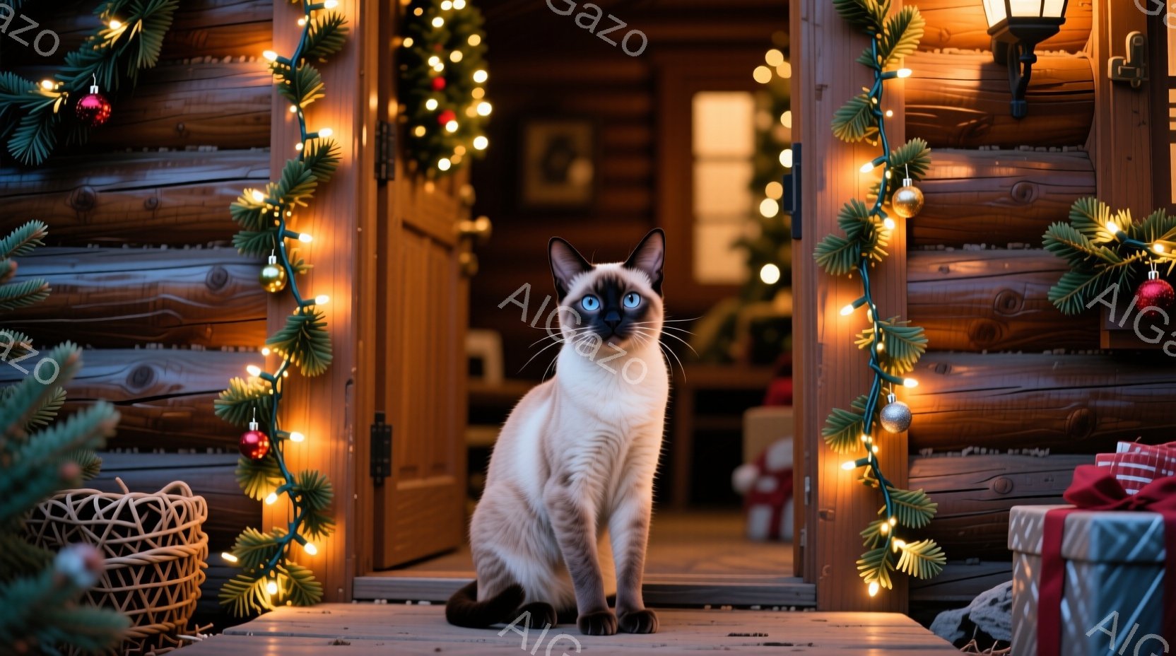 シベリアンハスキーのような毛色の猫が、クリスマスデコレーションで飾られた家の外で座っています。暖色系の照明が猫の毛並みを照らし、背景の木製の壁と装飾を際立たせています。家の中はぼんやりと明るく、穏やかで心地よい雰囲気が漂っています。