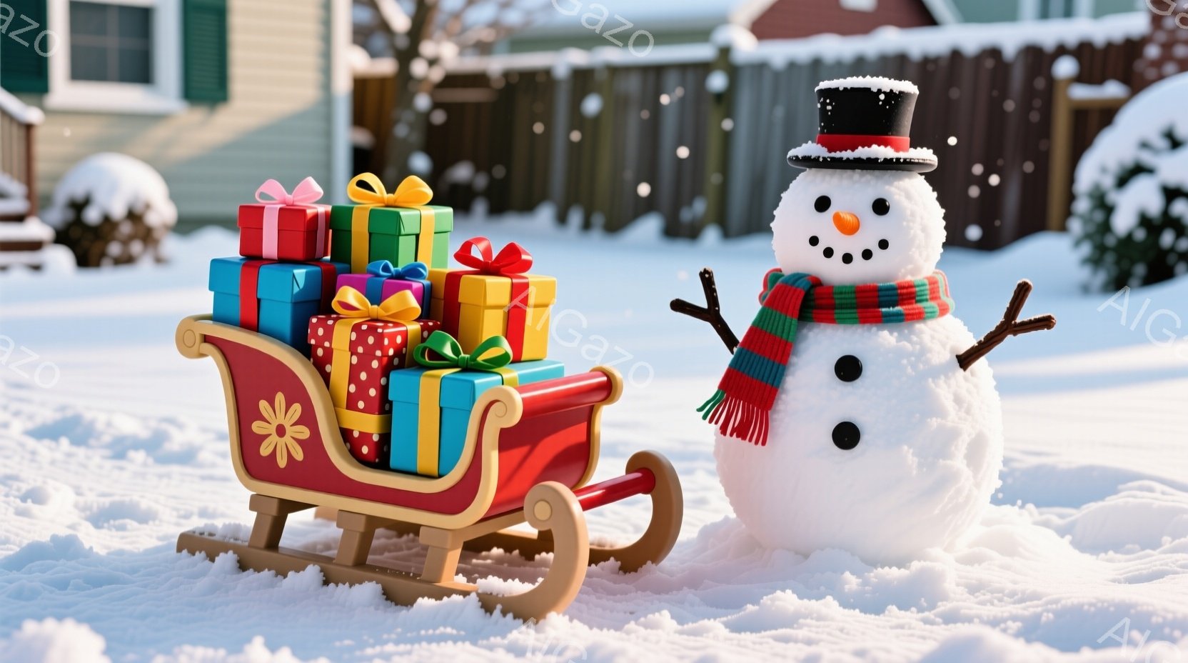 雪景色の中に、赤いそりがプレゼントの山でいっぱいになっている。隣には、黒いシルクハット、赤いマフラー、そして炭で作られた目と口を持つ雪だるまが立っており、枝で作られた腕を広げている。背景には、雪で覆われた庭と、クリーム色の壁と緑色のトリムを持つ家が見える。