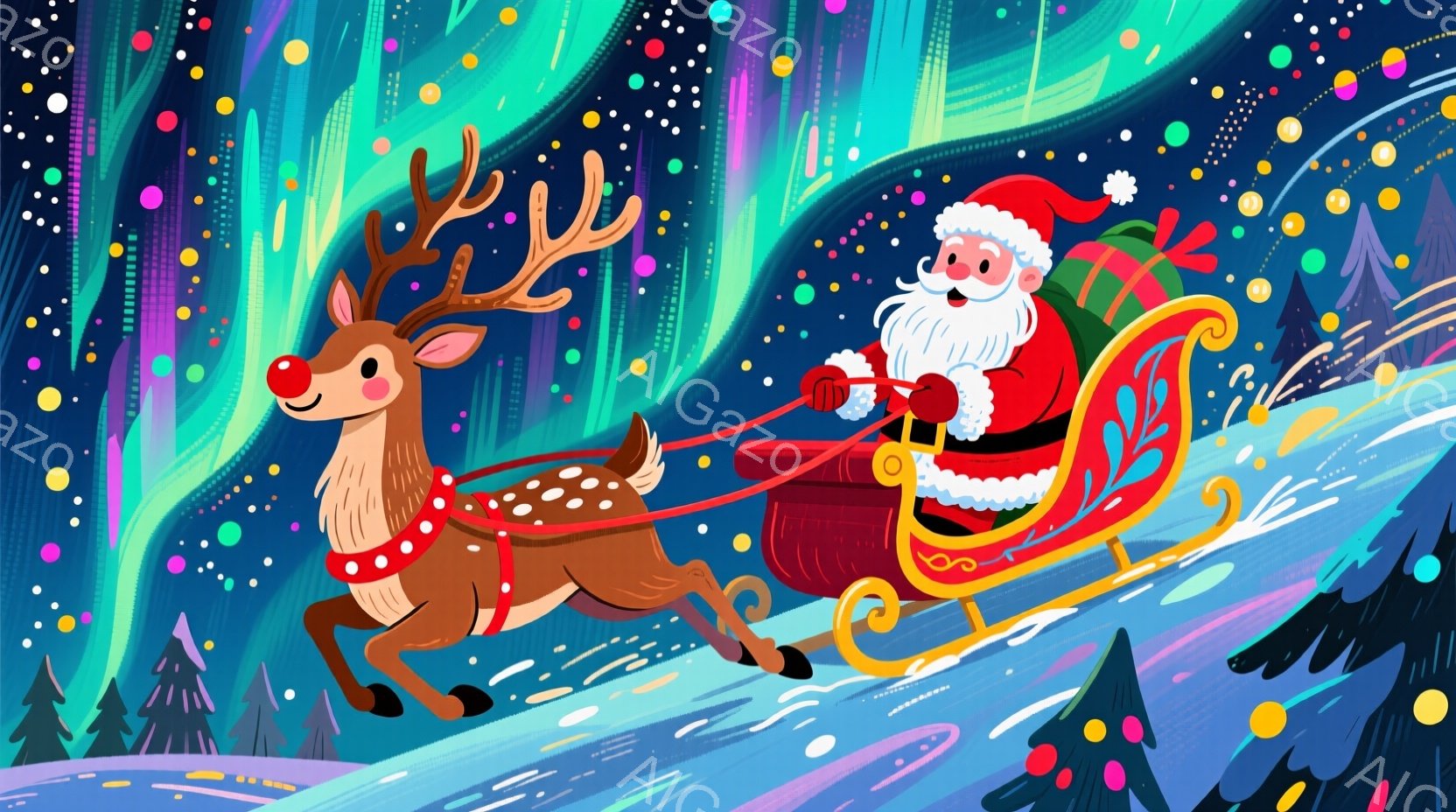 サンタクロースは、鮮やかな赤色の衣装を身につけ、白いひげを蓄え、笑顔でそりを引くトナカイを操っています。背景には、針葉樹の森とオーロラのようなカラフルな光が広がり、雪の積もった地面にはきらめく足跡が残っています。全体的に、明るくお祝いの雰囲気で、冬の魔法のような情景が描かれています。