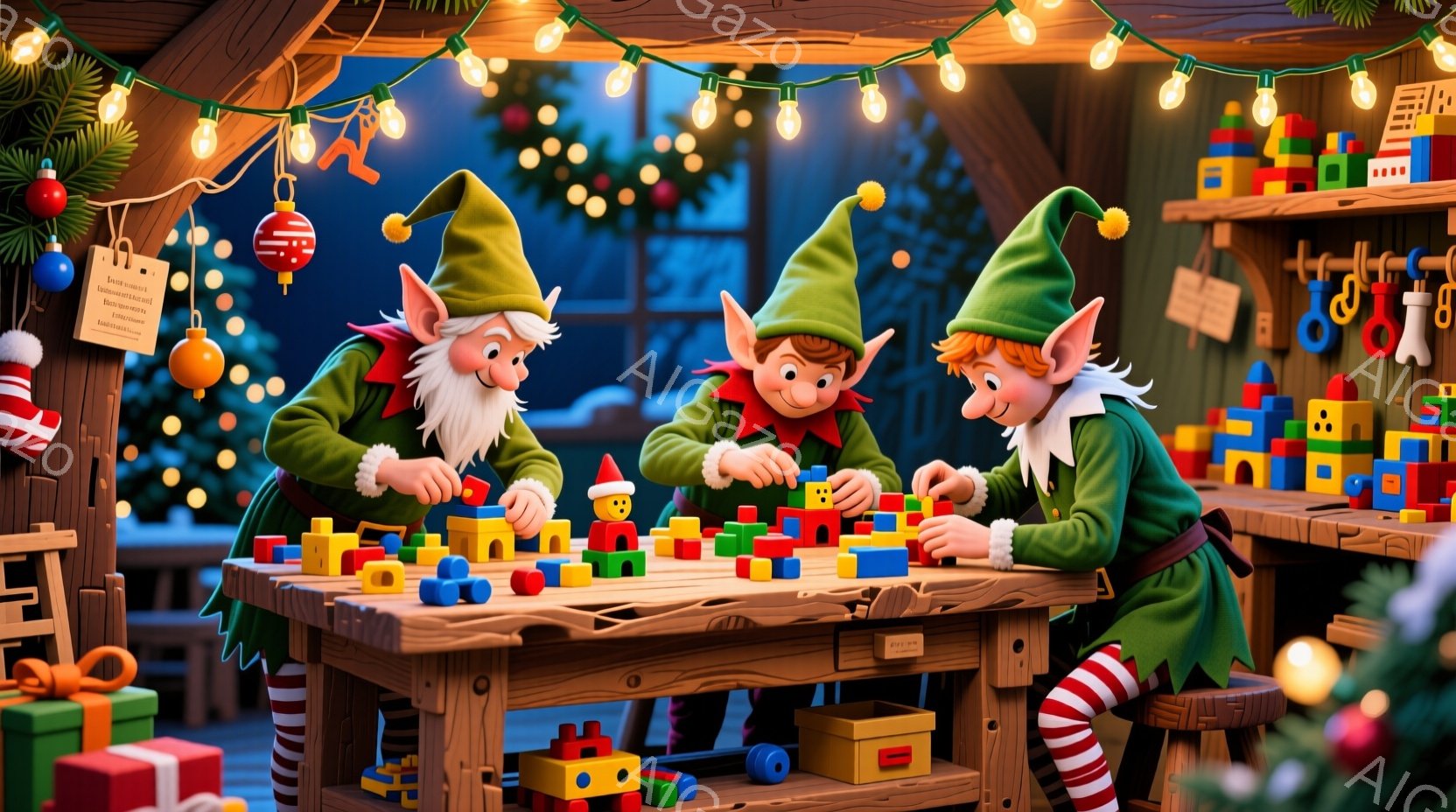 暖炉のある作業場で、エルフの子供たちがカラフルな積み木で遊んでいます。緑色の帽子とベスト、赤いシャツを着ており、いたずらっぽい笑顔で集中して積み木を積み上げています。背景にはプレゼントや木のおもちゃが積み上げられ、雪が降る夜の景色が見える窓があり、温かく幻想的なクリスマスの雰囲気を醸し出しています。