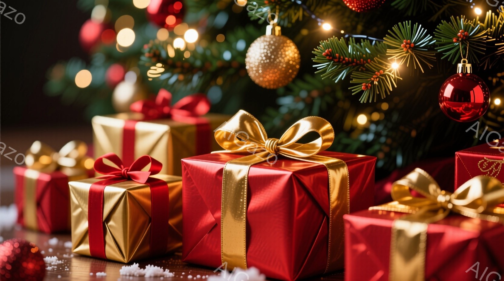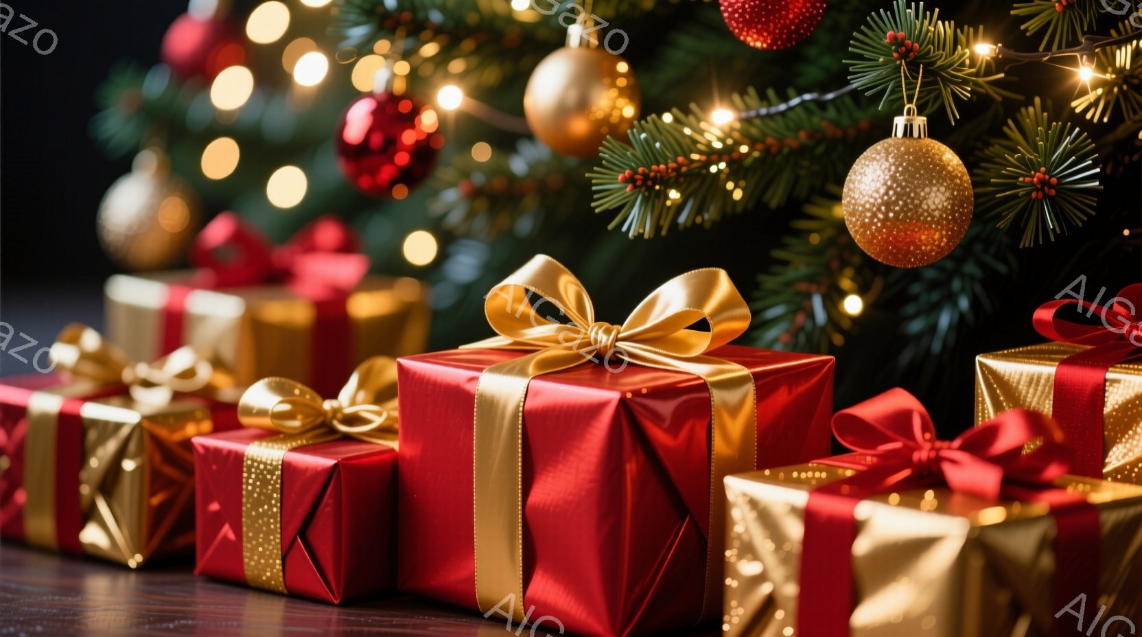 真っ赤なギフトボックスがいくつか、クリスマスツリーの背景に並べられています。ギフトボックスは金色のリボンで美しく飾られ、キラキラと光るオーナメントと共に、温かく華やかなクリスマスの雰囲気を醸し出しています。背景には緑豊かなモミの枝が見え、ホリデーシーズンのお祝いの喜びを感じさせます。