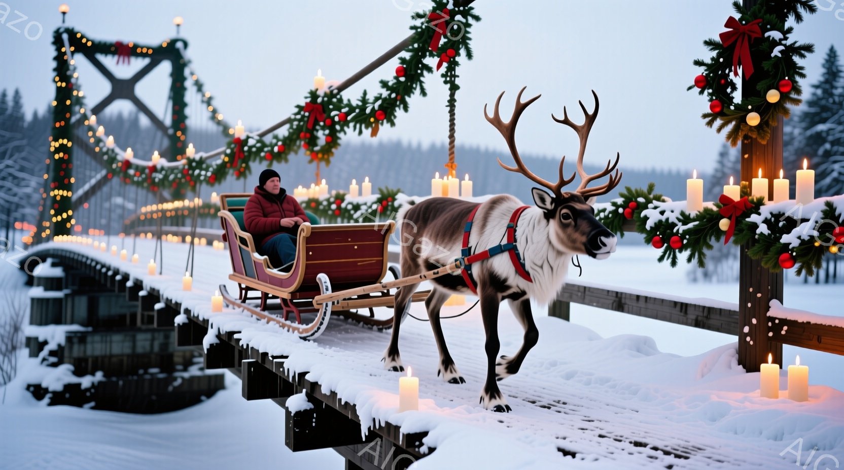 雪に覆われた木の橋の上で、赤いそりがトナカイに引かれている。運転席には帽子をかぶった人物が座っており、その表情ははっきりと見えないが、穏やかな雰囲気が伝わってくる。橋の両側にはクリスマス装飾が施され、背景には雪に覆われた森が広がり、冬の暖かく幻想的な雰囲気を醸し出している。
