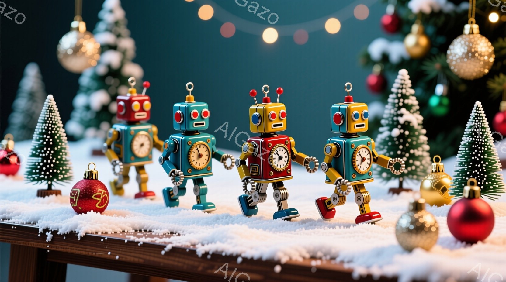 玩具のようなレトロなロボットたちが、雪景色の中に整列して立っています。彼らはそれぞれ異なる色(青、緑、赤、黄)のボディを持ち、顔にはアナログ時計の文字盤が組み込まれています。背景には、雪に覆われた小さな家やクリスマスツリーが配置され、赤い、青い、金のオーナメントが散りばめられています。