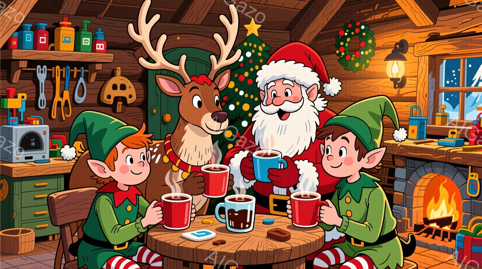 温かい暖炉のそばで、サンタクロースと2人のエルフが丸い木のテーブルを囲んで温かい飲み物を楽しんでいます。エルフたちは緑色の服と赤い縞模様の靴下を着ており、明るい笑顔で飲み物をかき混ぜています。背景にはプレゼントや装飾が積まれた棚があり、雪が降る森の様子が窓から見え、全体的に温かく、お祝いムードに満ちた雰囲気です。