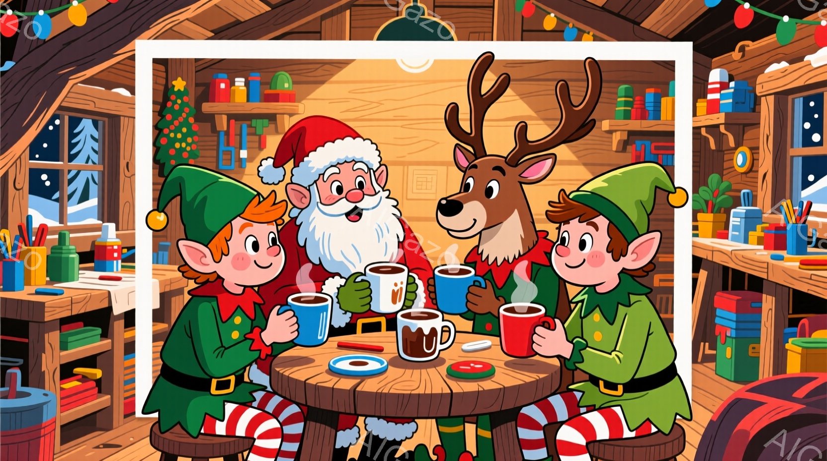 雪景色の中に一頭のトナカイが立っている。その角には色とりどりのイルミネーションが巻き付けられており、体は雪に汚れていない。背景には暗い森が広がり、遠くには薄い光が差し込んでいる。