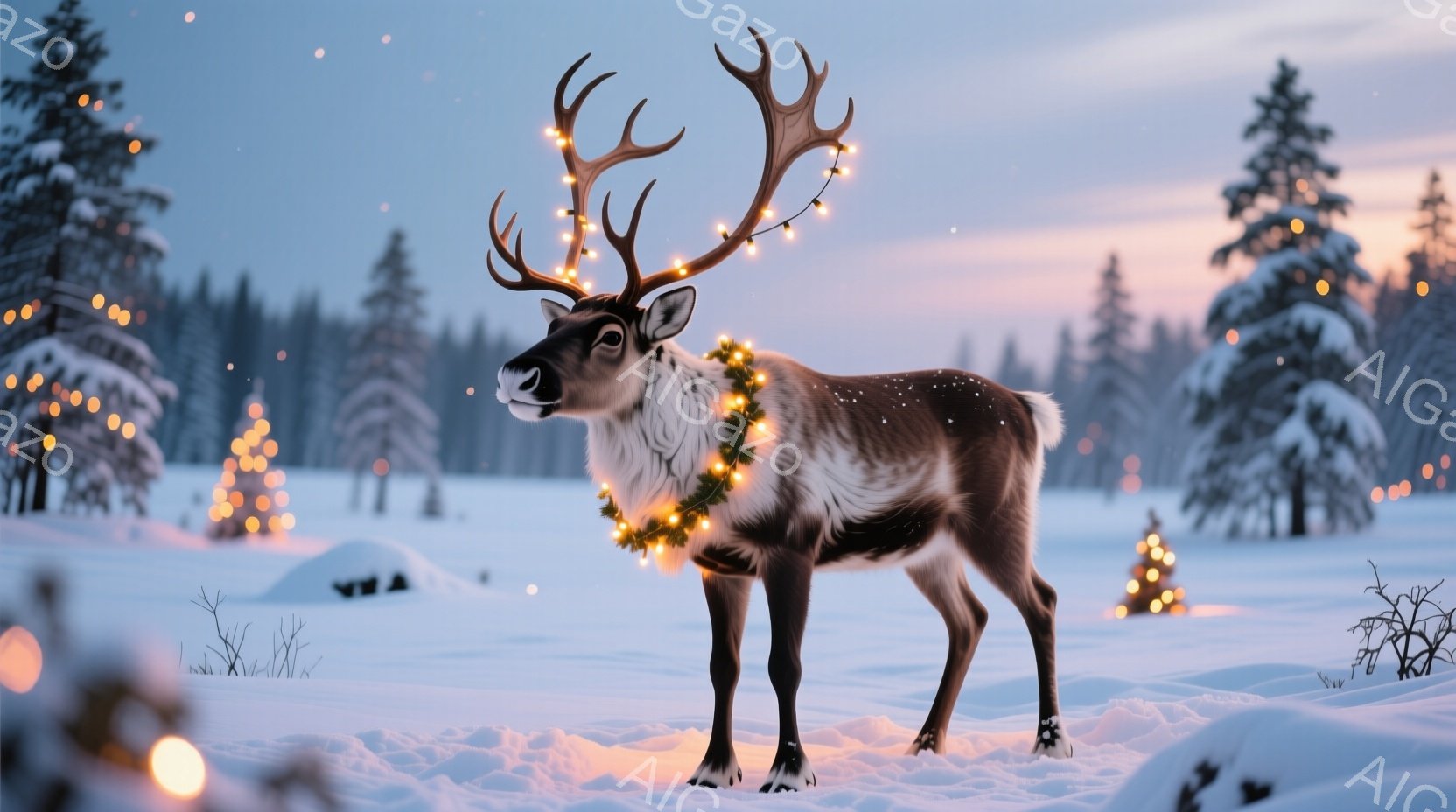 白い雪景色の中に、角に電飾を巻き付けたトナカイが立っている。トナカイは凛々しい表情で正面を見据え、冬の森にひっそりとたたずんでいる。背景には雪に覆われた木々が広がり、穏やかで幻想的な雰囲気を醸し出している。