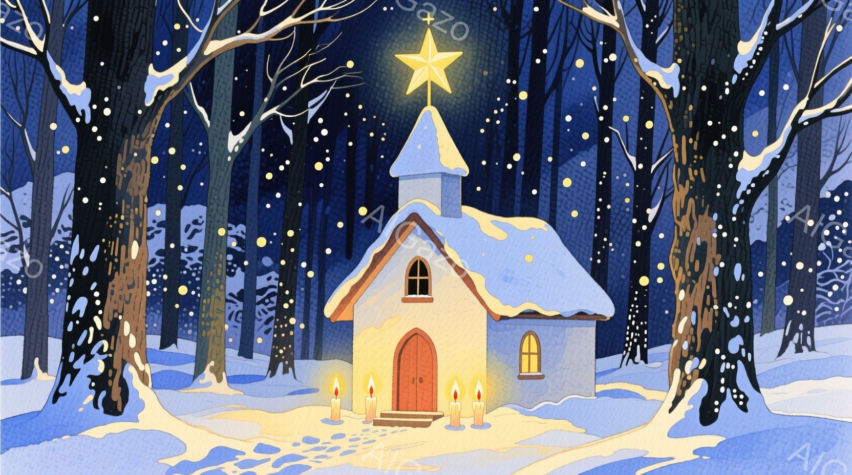 吹雪の中、天使が提灯を掲げ、先導している様子が描かれている。天使は白いローブに薄いピンク色のドレープをまとい、素足で雪上を歩いている。背景には、杖を持った人々が雪の中を歩き、遠くには木々が雪に覆われた冬景色が広がっている。