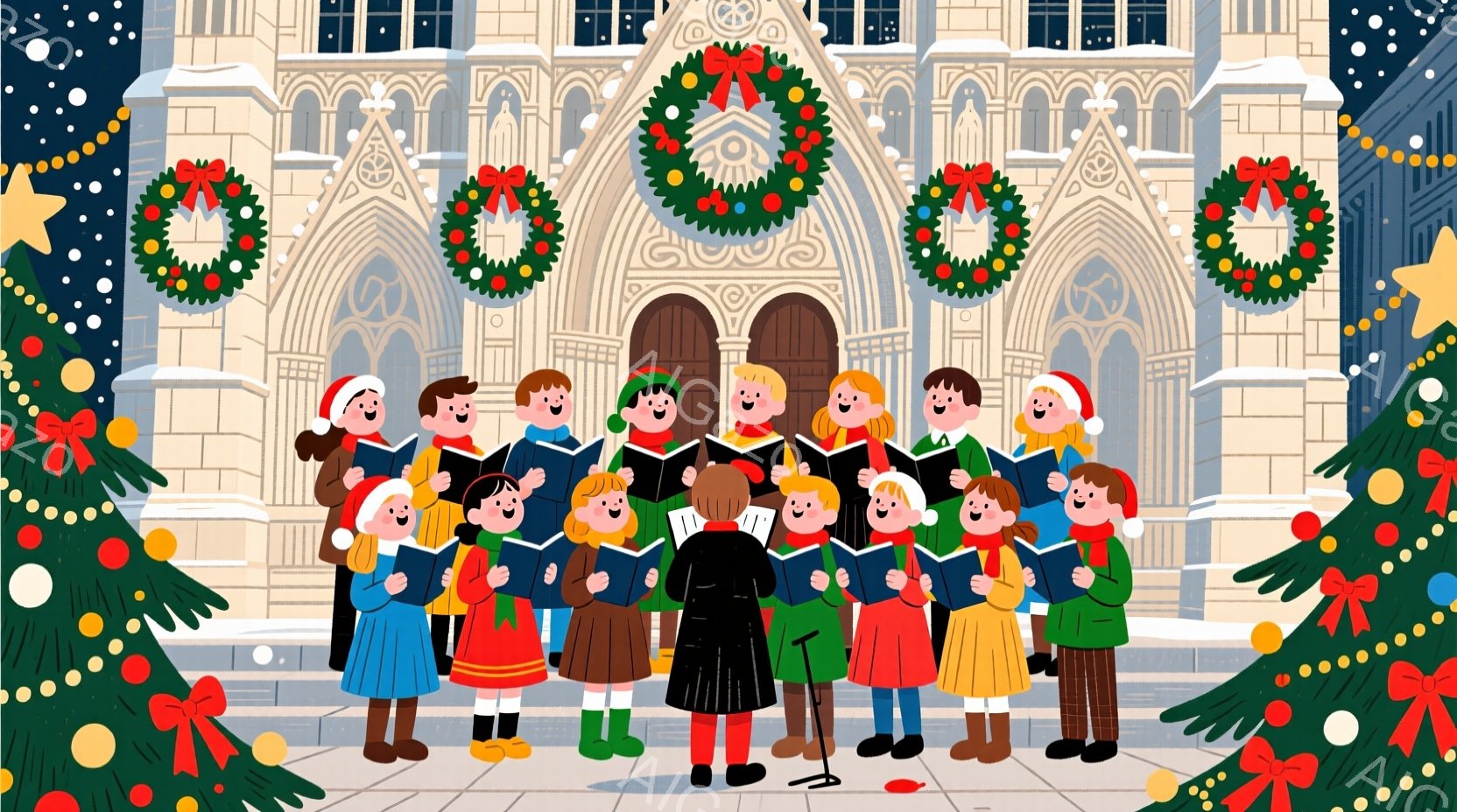 凍てつくような雪の降る中、ステンドグラスが美しい教会内部が描かれている。祭壇には無数のロウソクが灯され、雪景色と相まって神聖で静謐な雰囲気を醸し出している。ステンドグラスには聖母マリアと幼子イエス、そして他の聖人たちが描かれ、暖かく、希望に満ちた光を放っている。