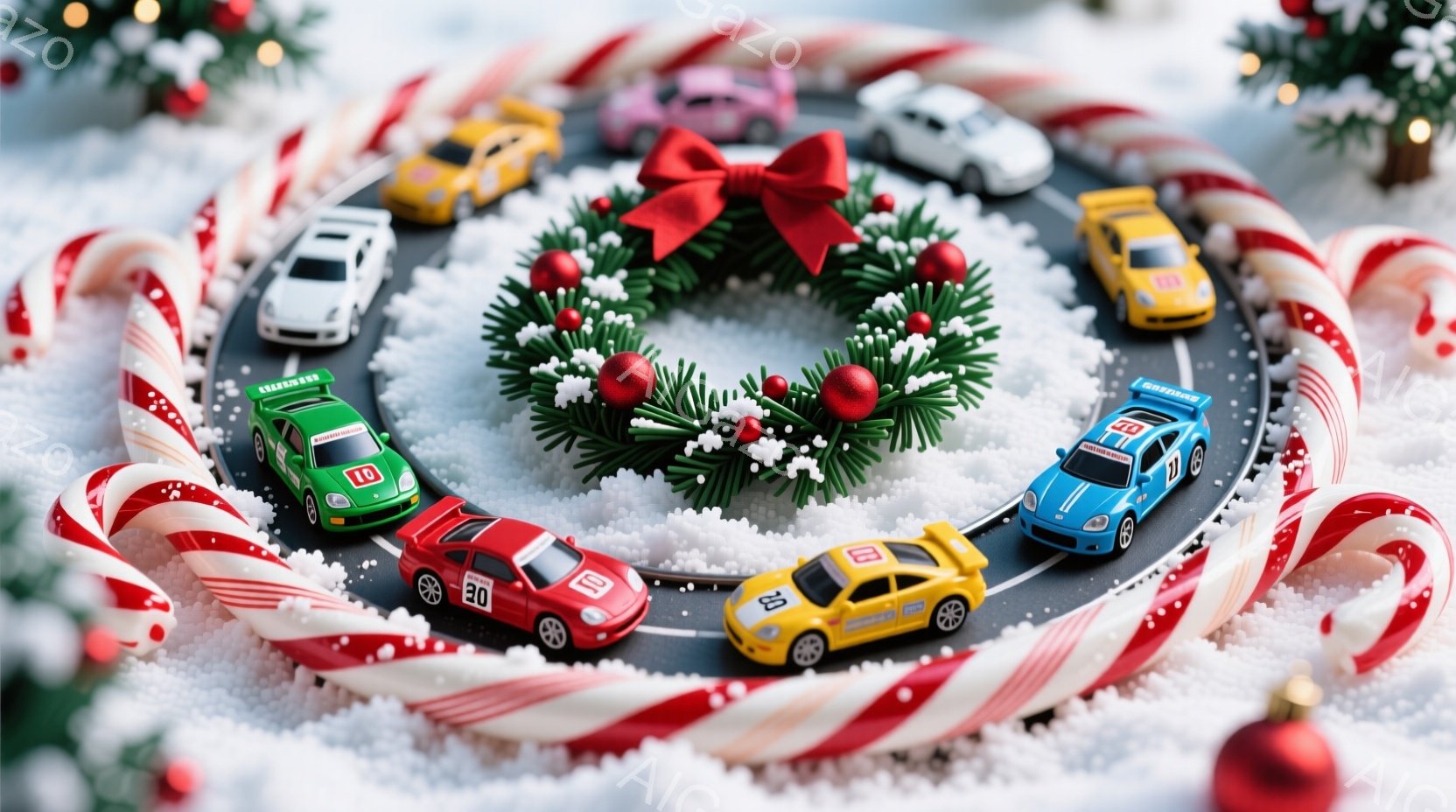鮮やかなキャンディケーンが雪の上に敷き詰められ、その中心にクリスマスリースが飾られています。ミニカーがリースの周りを走るように配置されており、まるでレーストラックのようです。全体的に暖かく、お祝いムード満点のクリスマスの情景が表現されています。