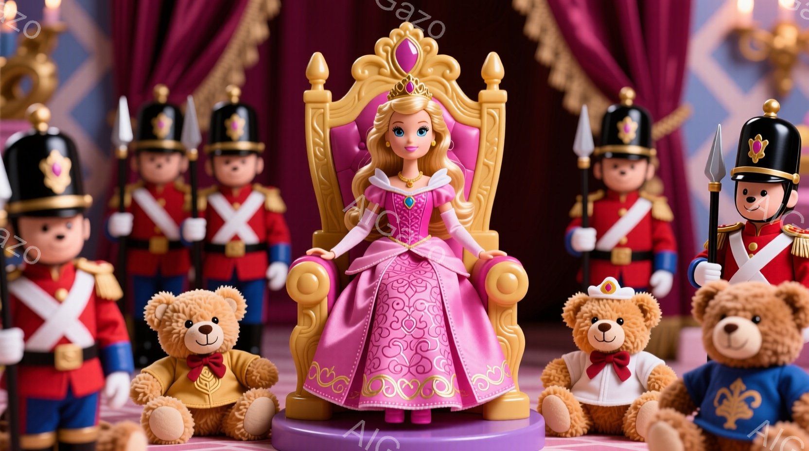 ピンク色の豪華なドレスを着た女性が、金色の装飾が施された椅子に座っています。彼女は金髪を優雅にカールさせ、微笑んでいます。背景には、兵士の格好をしたテディベアと、薄いピンク色のドレープがあり、おとぎ話のような雰囲気です。