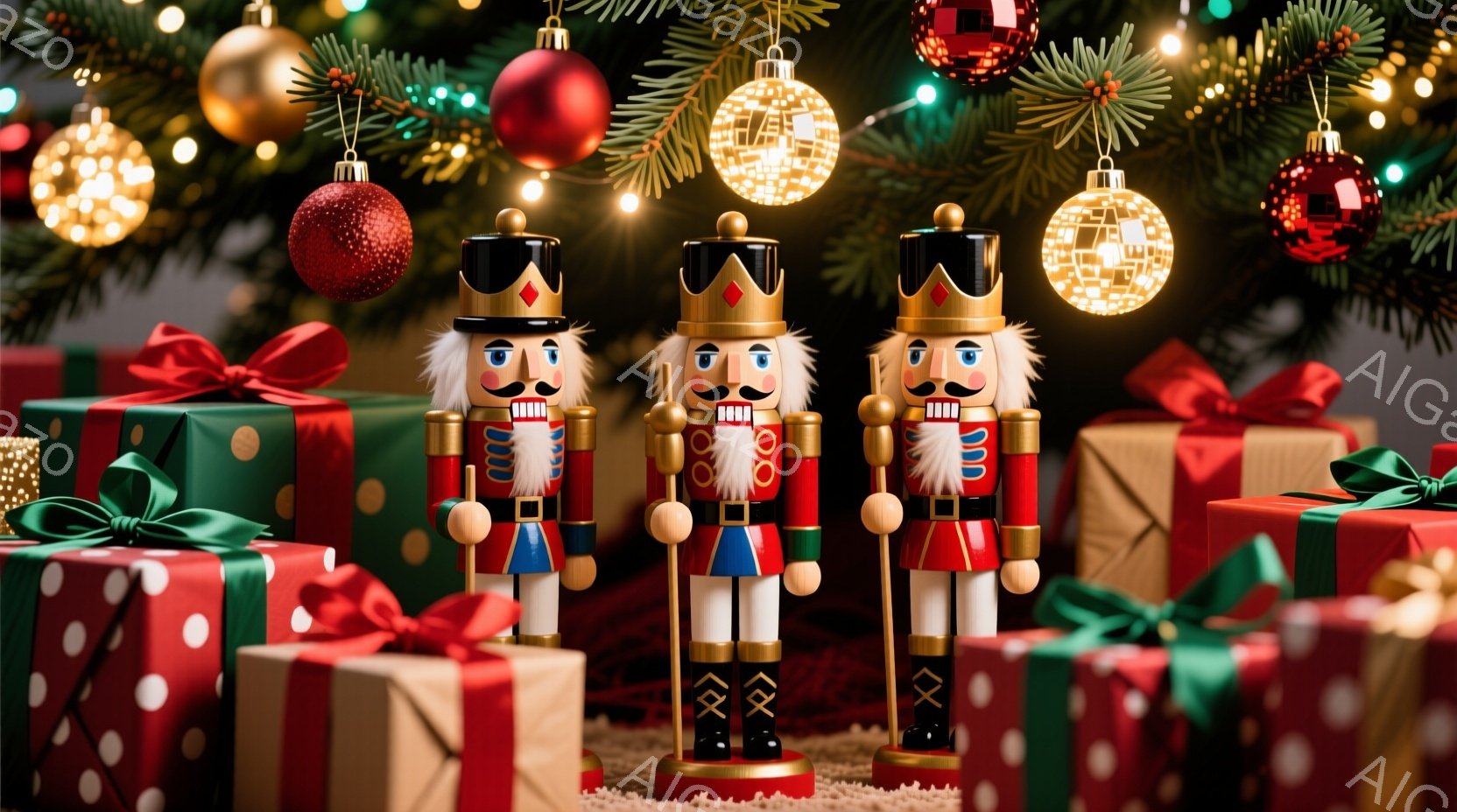 クリスマスツリーの前に、兵隊の形をした木製のおもちゃが整列しています。兵隊たちは赤いジャケット、黒いズボン、白いひげ、そして誇らしげな表情をしています。背景には緑と赤のクリスマスプレゼントが積み重ねられ、きらびやかなオーナメントで飾られたクリスマスツリーが暖かく華やかな雰囲気を醸し出しています。
