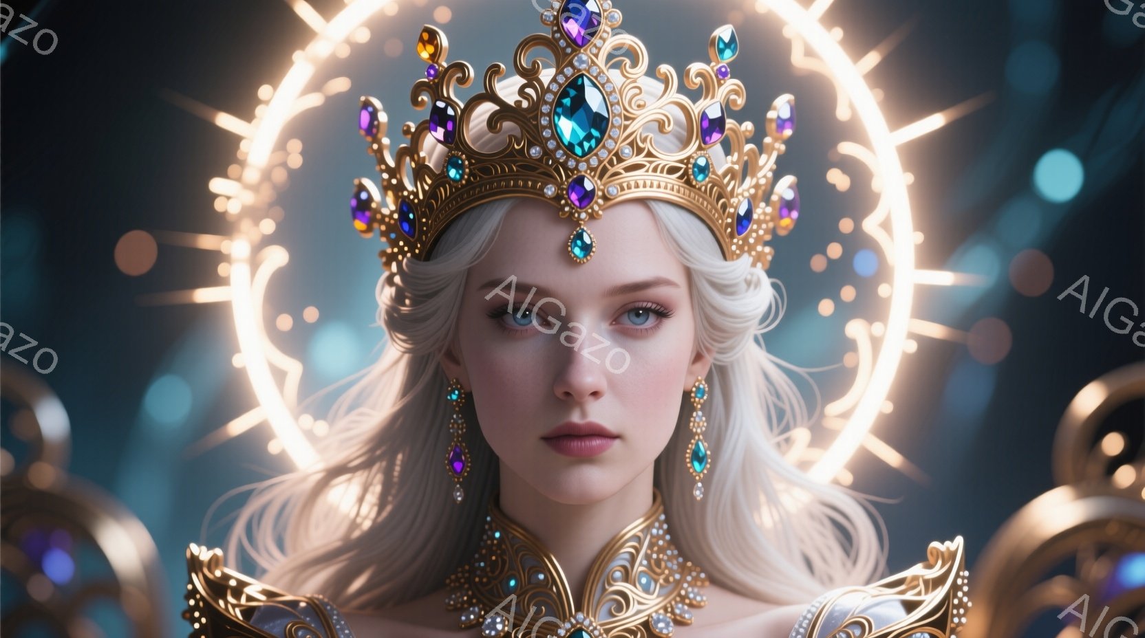 白い髪と青い瞳を持つ女性が描かれている。彼女は豪華な金色のティアラと耳飾りを身に着け、複雑な模様の衣装をまとっている。背景には光る円が配置され、全体的に神秘的で高貴な雰囲気を醸し出している。