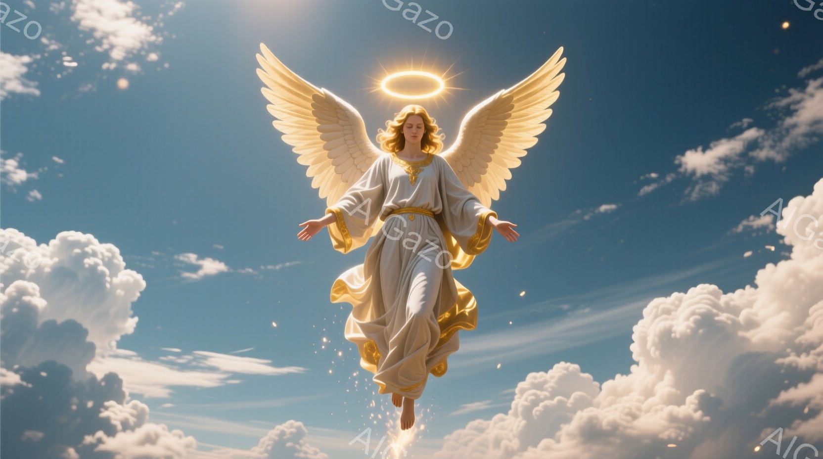 天使が雲の上に浮かんでおり、純白の長いドレスと金色の帯で身を包んでいます。彼女は金色の巻き毛で、穏やかな表情で両腕を広げ、頭上には金色の光輪が輝いています。背景には青空とふわふわとした白い雲が広がり、彼女の周囲にはキラキラとした光の粒子が舞い、神聖で穏やかな雰囲気を醸し出しています。