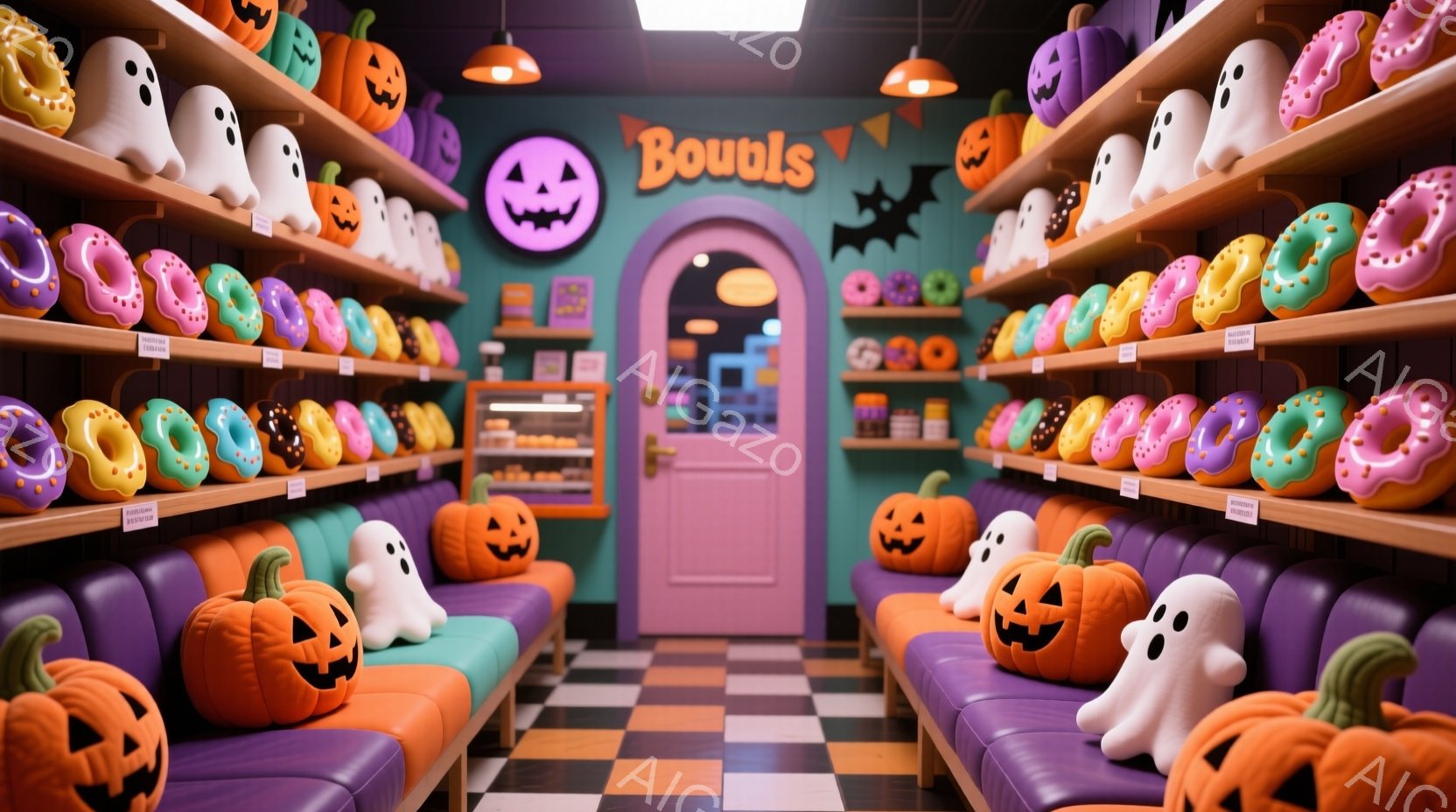 ハロウィーンをテーマにしたドーナツ店の内部です。紫色のブース席には、様々な表情をしたジャック・オー・ランタンのクッションが置かれ、壁にはカラフルなドーナツがずらりと並んでいます。店内の装飾は、お化けやカボチャで溢れ、ハロウィーンの楽しい雰囲気を演出しています。