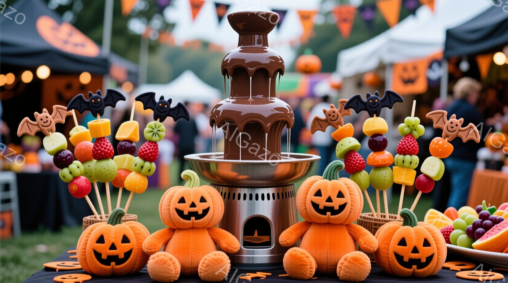 ハロウィーンの装飾が施されたテーブルの上には、フルーツ串とチョコレートファウンテンが並べられています。背景には、ハロウィーンの飾り付けがされたテントや人々が見え、秋晴れの屋外イベントの様子が伺えます。全体的に、明るく楽しいお祭りの雰囲気で、季節感あふれる光景です。