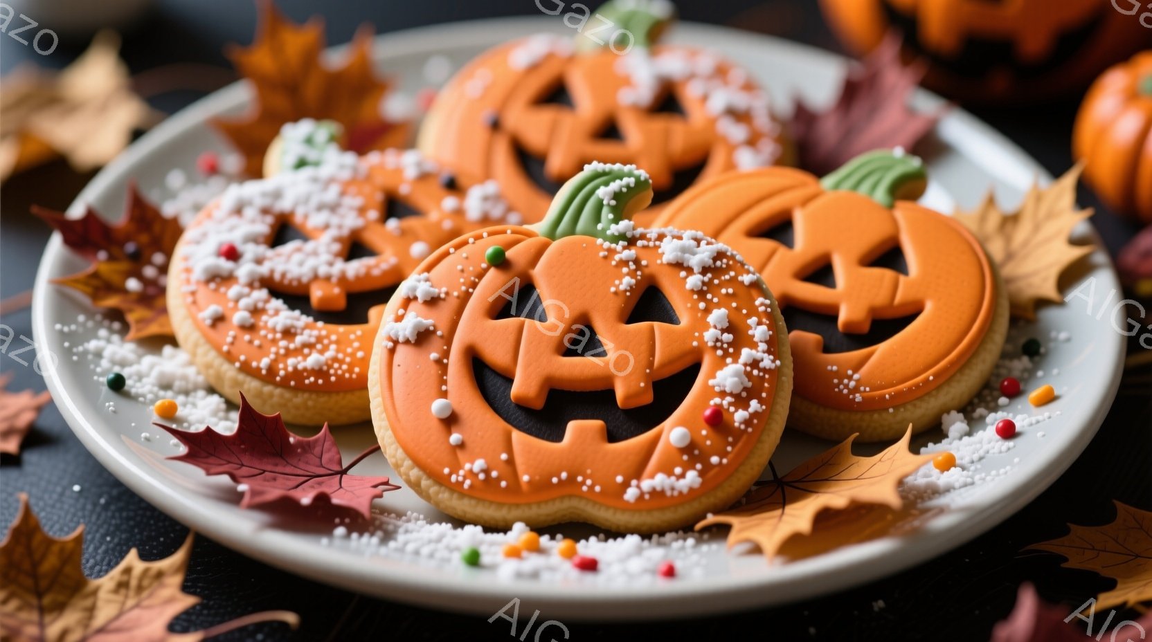 白いお皿に、ハロウィーン風のクッキーが数枚並べられています。オレンジ色のクッキーは、ジャック・オー・ランタンの形をしており、緑色のつるがついています。周りには、砂糖のような白い粉と、紅葉した葉が散りばめられており、秋の雰囲気を感じさせます。