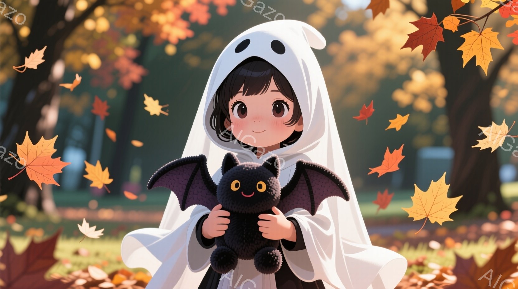 茶色の髪を少しカールさせた女の子が、白いお化けの衣装を着て、黒いコウモリのぬいぐるみを抱えています。彼女は少し頬を赤らめ、優しい笑顔を浮かべており、背景には秋の紅葉と木々が見えます。全体的に暖かく、可愛らしいハロウィンの雰囲気が漂っています。