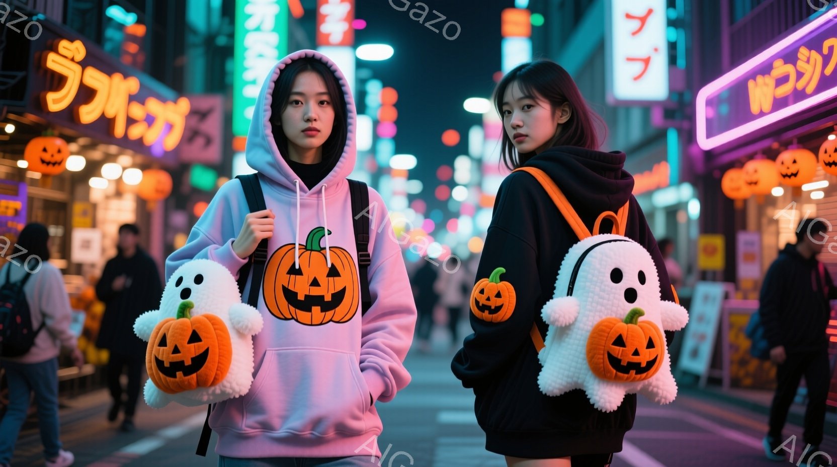 二人の若い女性が、ハロウィーンをテーマにした装いで歩いています。彼女たちは、オレンジ色のカボチャと白い幽霊のモチーフが描かれた白いパーカーを着ており、それぞれ肩に大きな幽霊のぬいぐるみを抱えています。背景には、ネオンライトに照らされた賑やかな街並みがあり、ハロウィーンの装飾が施された店舗が見え、活気のあるお祭りの雰囲気を醸し出しています。