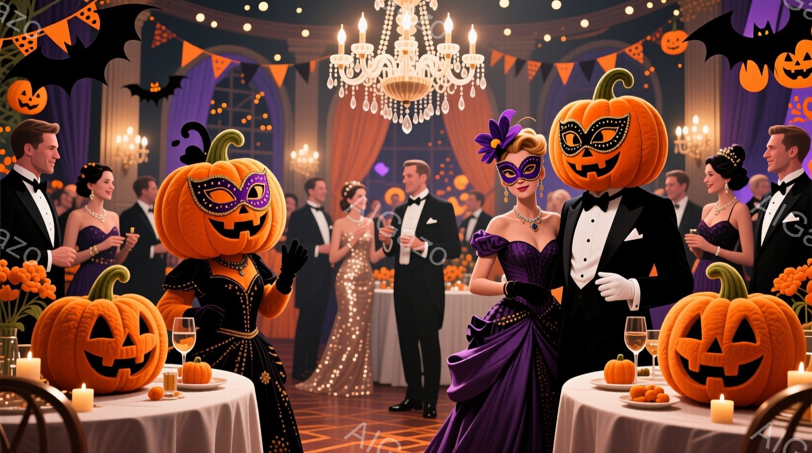 ハロウィーンパーティーの盛大な宴会場が描かれています。男性は黒いタキシード、女性は紫と黒の豪華なドレスを身につけ、仮装姿で楽しんでいます。背景には、たくさんのカボチャの装飾と、シャンデリア、そして他の参加者たちがおり、華やかで賑やかな雰囲気が伝わってきます。