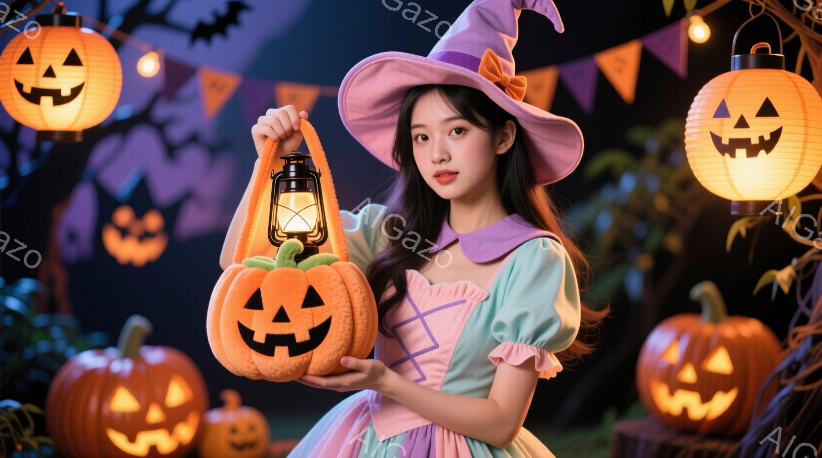 金髪の女性がハロウィーンの衣装を着て、かぼちゃのランタンと提灯を手に持っています。彼女はピンクと紫色のフリルスカートと白いブラウスを着ており、黒いリボンで髪を結んでいます。背景には、かぼちゃの形をした提灯やコウモリの飾りがあり、ハロウィーンらしい賑やかな雰囲気が漂っています。