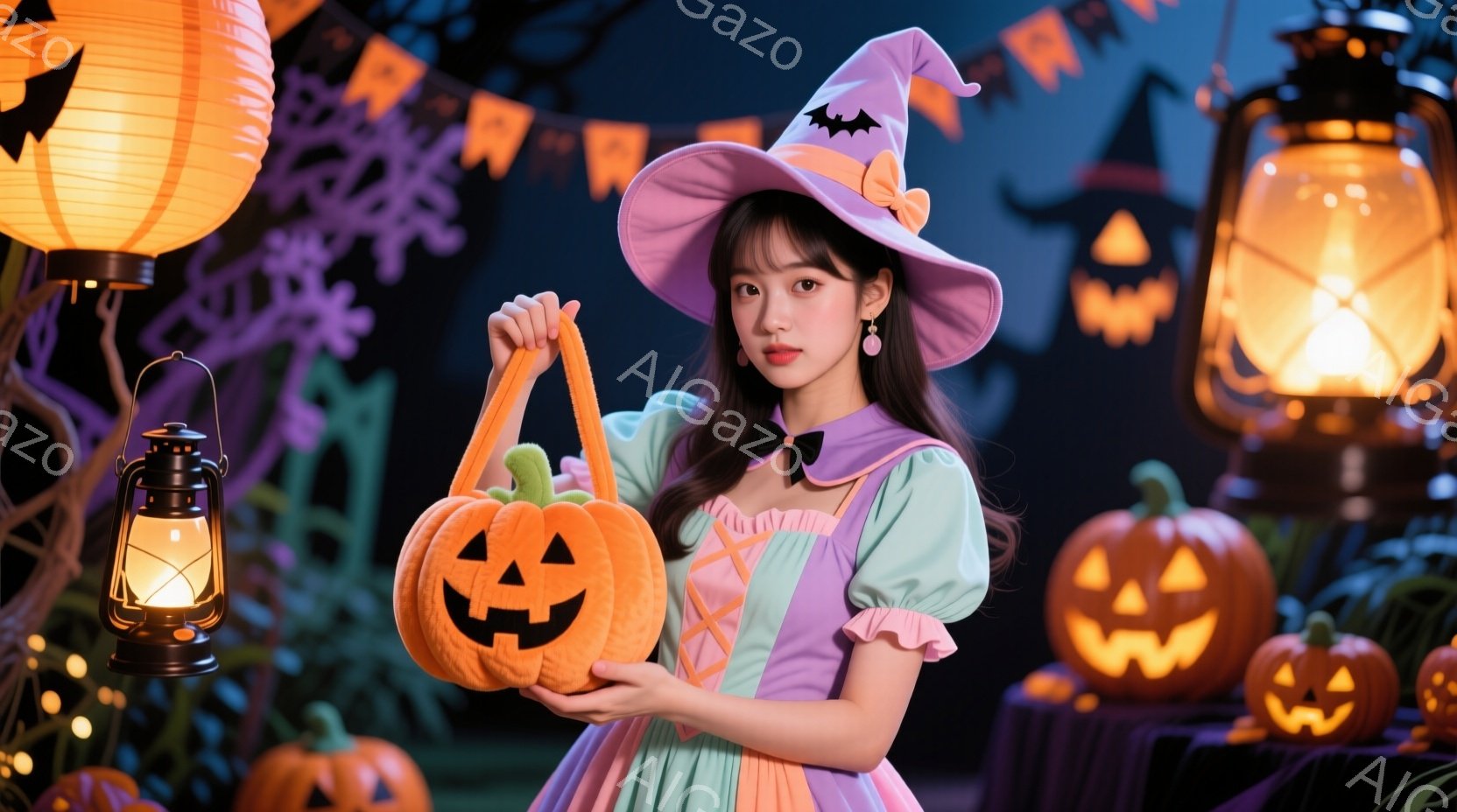 明るい紫色の帽子を被り、パステルグリーンのワンピースを着た若い女性が、ジャック・オー・ランタンの形をしたバッグを持っています。彼女は微笑んでおり、ハロウィーンの飾り付け、特にオレンジ色のカボチャのランタンと紫色の旗が背景に散りばめられています。 全体的に、ハロウィーンの楽しい雰囲気を醸し出しています。