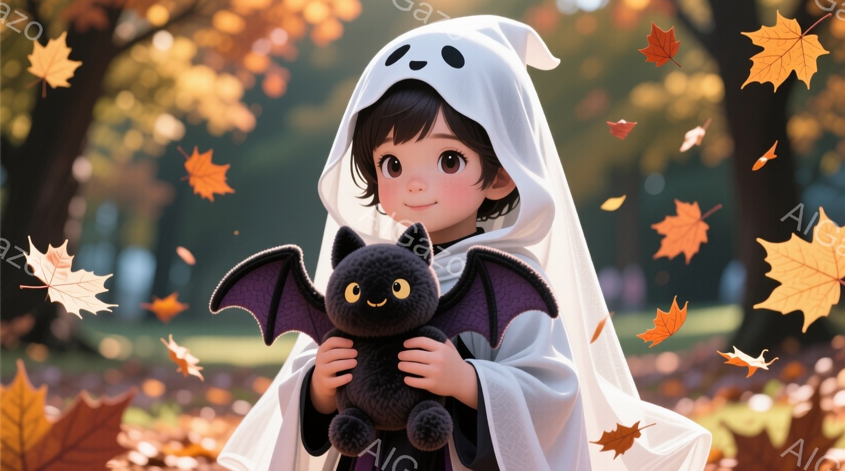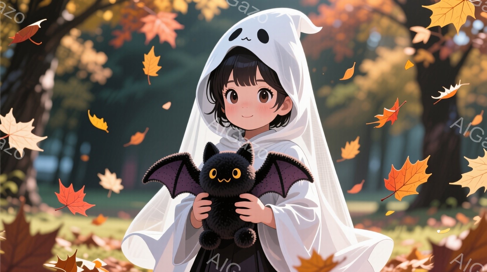 茶色の髪の少女が白いお化けの衣装を着て、黒いコウモリのぬいぐるみを抱えています。彼女は優しい笑顔で、少し上を見ているようです。背景には秋の木々と散り葉があり、暖かく穏やかな雰囲気を醸し出しています。