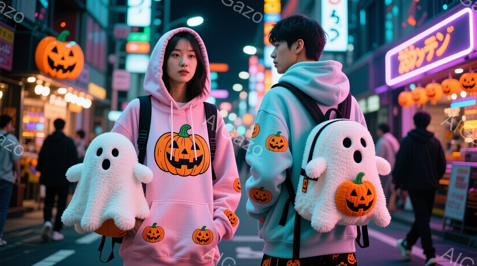 ハロウィーンの装飾が施された賑やかな日本の街並みを背景に、若い女性が立っています。彼女はオレンジ色のカボチャと白いお化けのキーホルダーが付いたピンク色のパーカーを着ており、髪は無造作に下ろされています。街並みには多くの人々が歩き、ハロウィーンのランタンが飾られており、お祭り騒ぎの楽しい雰囲気が漂っています。