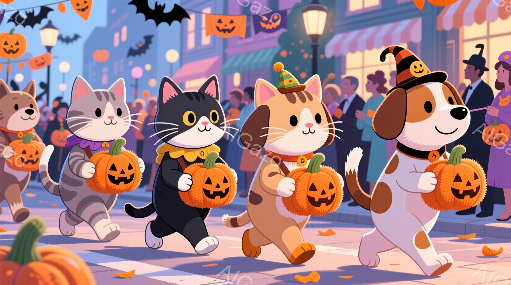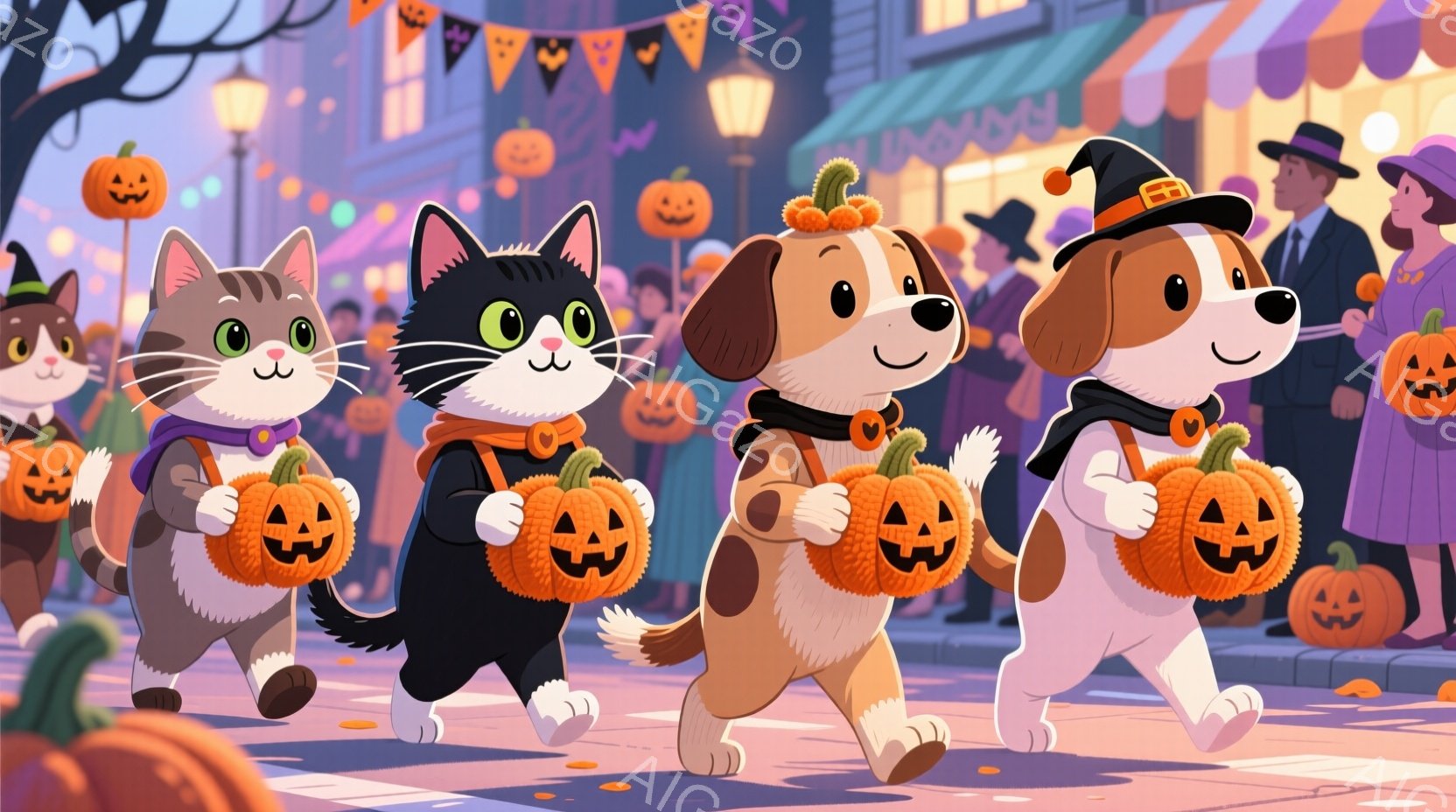 ハロウィーンの衣装を着た猫と犬たちが、それぞれカボチャの形をしたお菓子入れを持って歩いている様子が描かれている。背景には、ハロウィーンの飾り付けがされた建物や、夜空に飾られた旗があり、祝祭的な雰囲気が漂っている。全体的に明るく、楽しいハロウィーンの夜の様子が表現されている。
