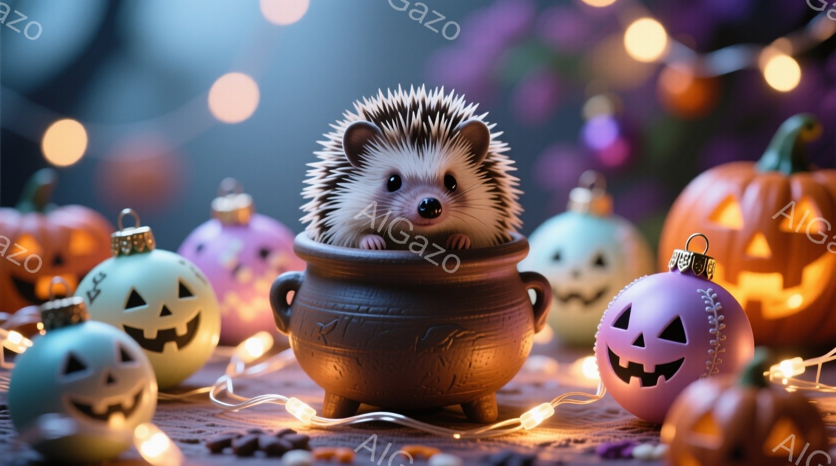 ハムスターが、ハロウィーンの飾り付けられたカボチャの家から顔を出しています。周囲には小さな幽霊やカボチャのランタンが配置され、緑色の苔が地面を覆っています。背景には、ぼやけたオレンジと紫色のハロウィーンの装飾が散りばめられ、お祭り気分を盛り上げています。