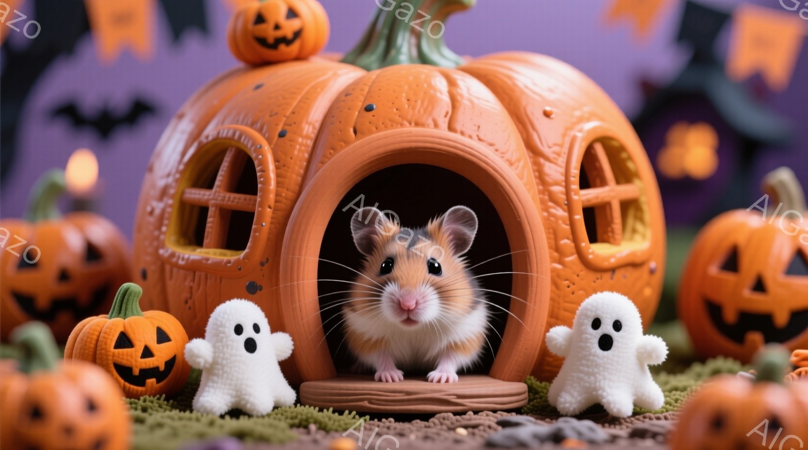 ハムスターがカボチャの家から顔を出しています。可愛らしいハムスターは、白い幽霊の人形に囲まれ、優しい表情をしています。背景には、様々な大きさのジャック・オー・ランタンが配置され、ハロウィーンらしい雰囲気で、柔らかい緑色の芝生と落ち葉が季節感を演出しています。