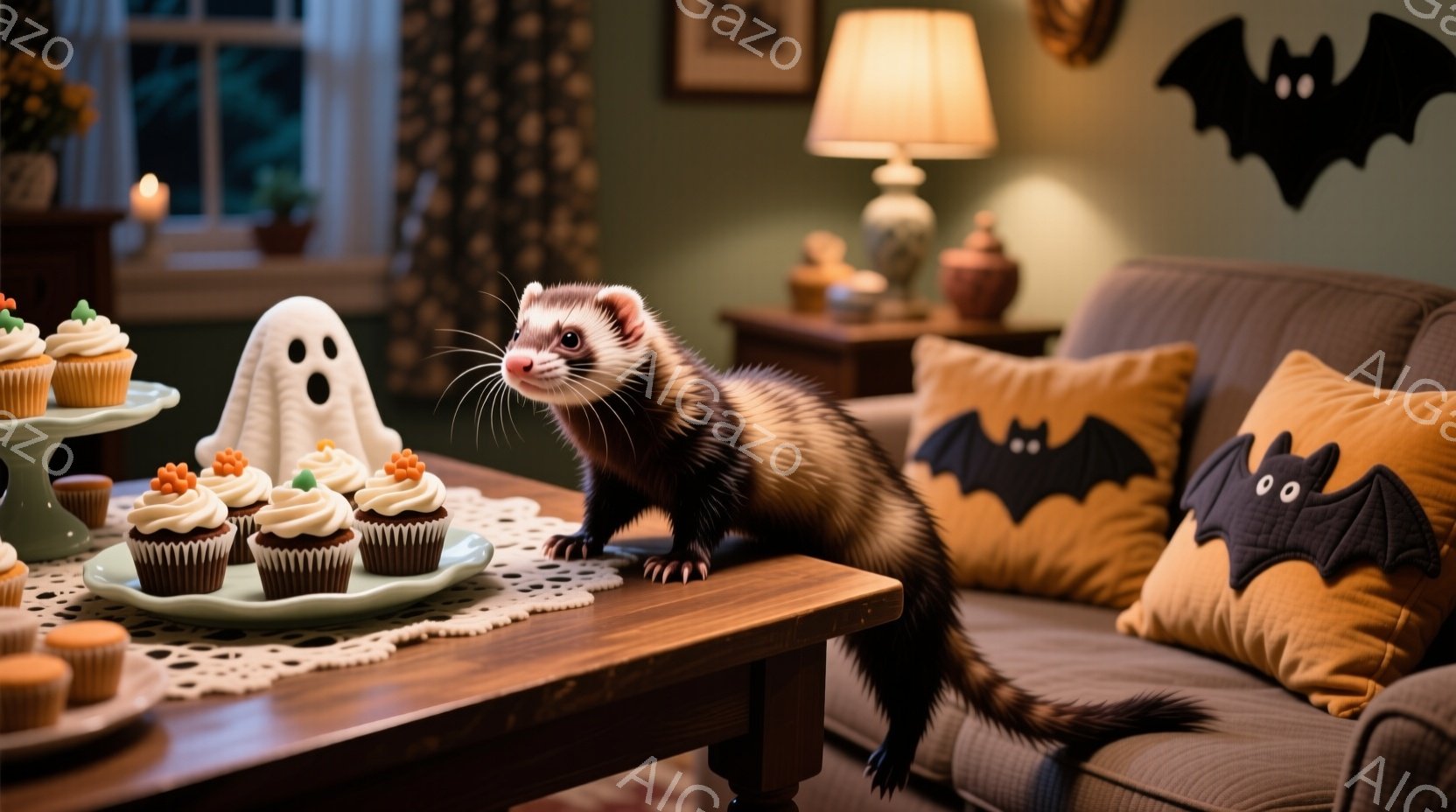 ハロウィーンの装飾が施された通りを、カボチャのバケツを持った犬と猫たちが歩いている様子が描かれている。それぞれの動物は、ハロウィーンをテーマにした帽子や襟巻を身につけ、楽しげな表情をしている。背景には、色とりどりのカボチャや装飾が施された建物が見え、秋のハロウィーンの賑やかな雰囲気が感じられる。