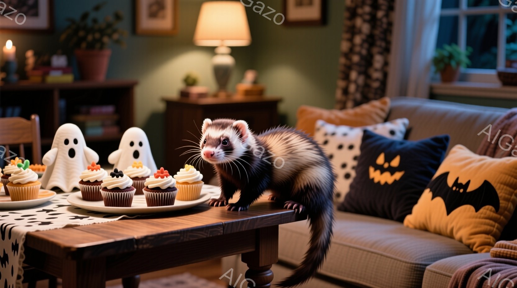 ハロウィーンの飾り付けがされたリビングルームで、イタチがテーブルの上を歩いています。テーブルにはカラフルなカップケーキや、幽霊の形の白い置物が並べられています。背景には、オレンジ色のクッションと黒いコウモリの形の装飾が置かれたソファがあり、暖かくお祝いの雰囲気です。