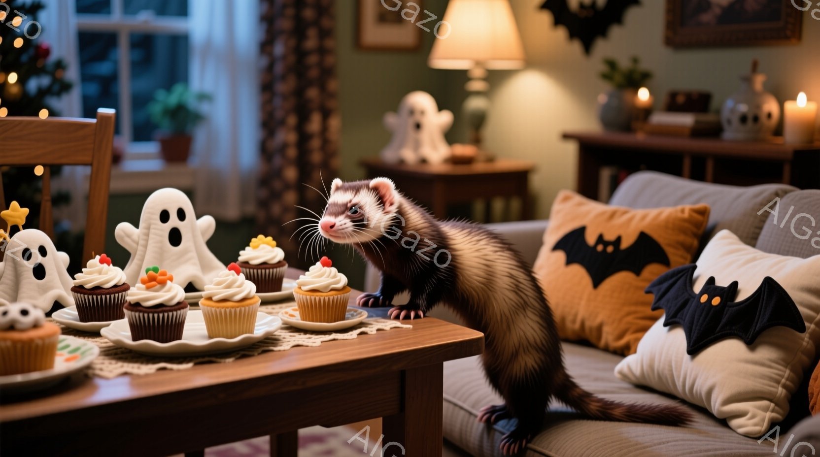 部屋の中には、ハロウィーンの装飾が施されたリビングルームが写っています。テーブルの上には、お化けの形をしたお菓子やカップケーキが並び、そのそばには好奇心旺盛なフェレットが立っており、何かを確かめようとしています。背景には、ハロウィーン柄のクッションが置かれたソファーと、植物が飾られた棚が見え、温かくお祝いムードにあふれた雰囲気です。