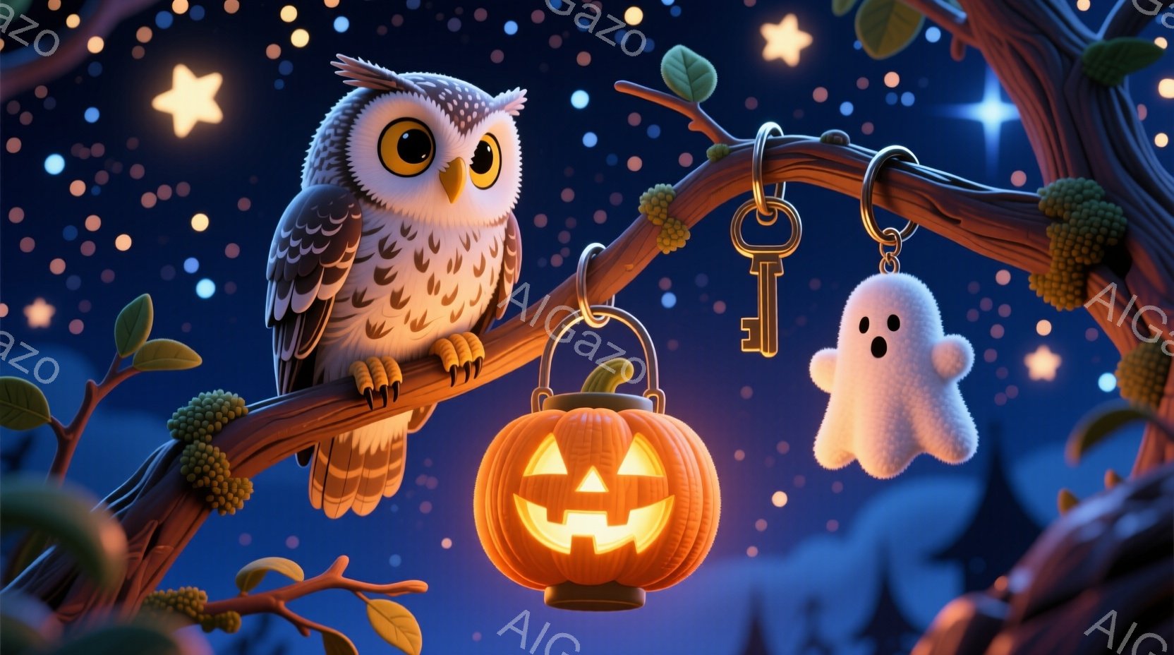 ふくろうが枝に止まり、光るジャック・オ・ランタンを見下ろしている。背景は暗い夜空で、星が散りばめられ、可愛らしい幽霊のキーホルダーがぶら下がっている。全体的に、ハロウィーンの夜の幻想的で温かい雰囲気である。