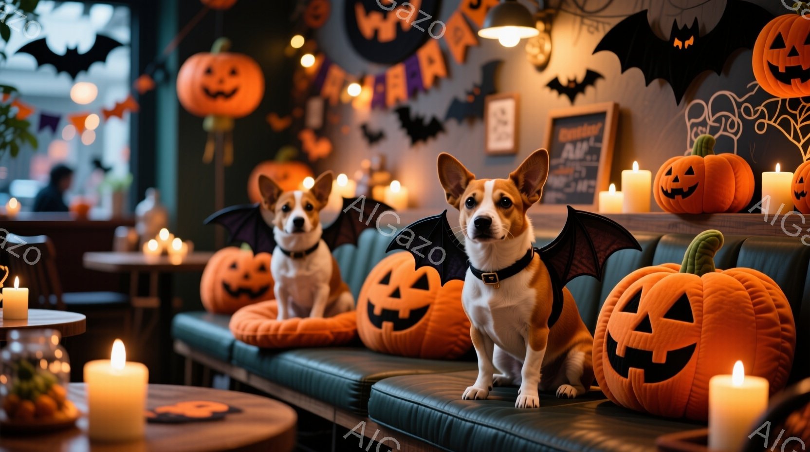 ハロウィーンの装飾がされたカフェのような場所で、2匹の犬が映っています。片方の犬は茶色と白の毛並みで、蝙蝠の羽のコスチュームを着ており、もう片方の犬はトリコロールカラーで赤い首輪をつけています。両犬ともテーブルや椅子が並んだカフェのソファに座っており、ハロウィーンのランタンとキャンドルが暖かく照らし出す、お祝いムードに満ちた空間が広がっています。