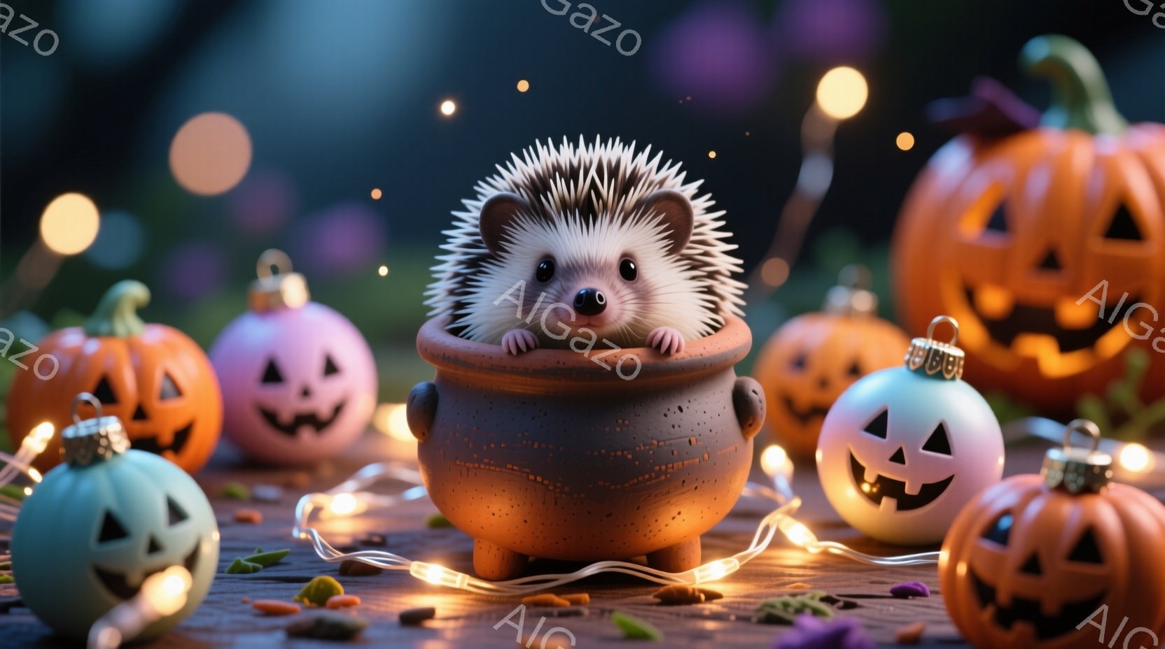 壺の中に可愛らしいハリネズミがちょこんと座っており、黒い目と小さな鼻が愛らしい表情をしています。背景にはオレンジと紫のハロウィーンの飾り付けのカボチャが並び、小さな電飾が暖かく灯っています。全体的に、暖かく、お祝いの雰囲気で、秋のハロウィーンシーズンを感じさせます。