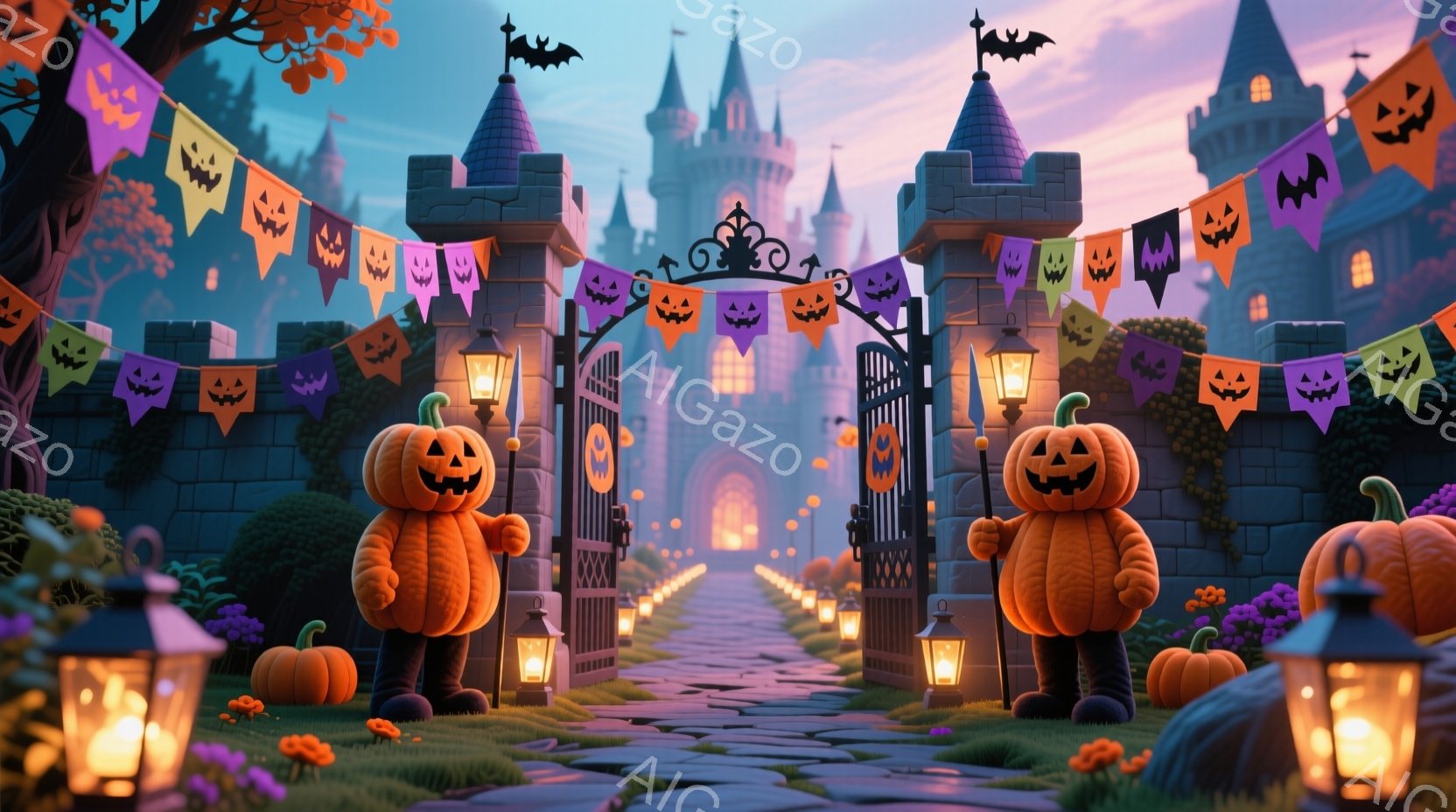 ハロウィーンの飾り付けが施された城への入り口で、カボチャの頭をした二人の人物が立っている。彼らは紫色のマントとブーツを身に着け、片手に剣を持っている。背景には、遠くに見える城、紫色のハロウィーンバナー、そして道に沿って並んだジャック・オ・ランタンがあり、不気味でありながらも楽しい雰囲気を醸し出している。