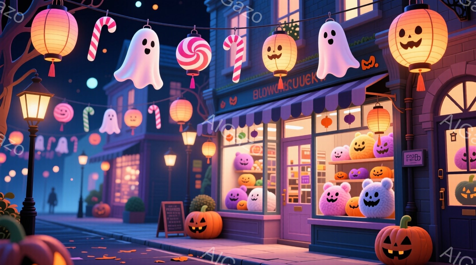 ハロウィーンの夜の賑やかな通りが描かれています。建物は紫とオレンジ色で彩られ、カボチャのランタンや可愛らしいお化けの飾り付けで溢れています。通りには一人の人物が歩いており、背景にはオレンジと紫のグラデーションがかった夜空が広がっています。