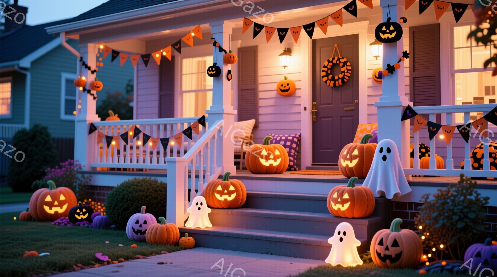ハローウィンの飾り付けで彩られた一軒家が、夕暮れ時の穏やかな光に照らされています。玄関の階段や芝生には、様々な大きさのジャック・オー・ランタンと幽霊が配置され、可愛らしい雰囲気を醸し出しています。背景には緑豊かな木々と住宅が見え、全体的に暖かく、お祭り気分を盛り上げる様子が伝わってきます。