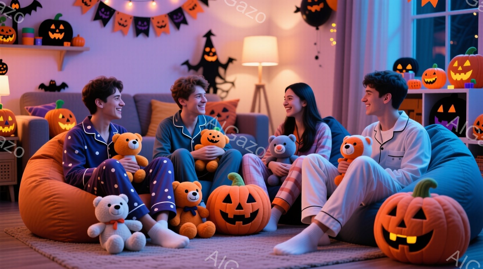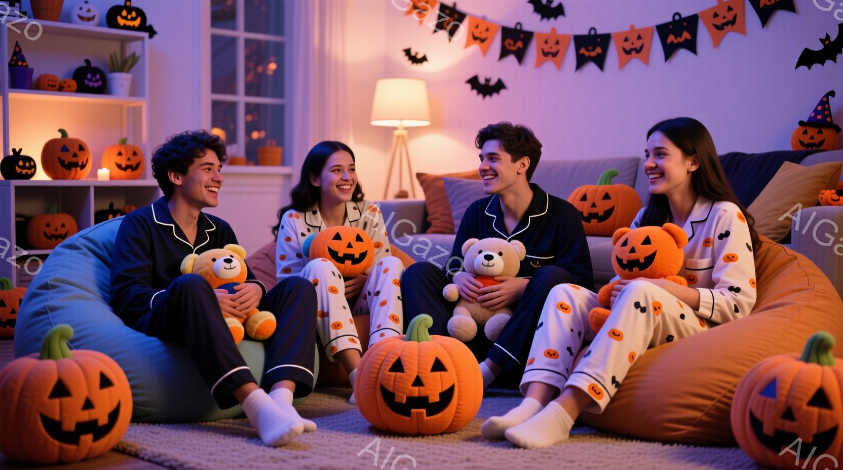 暖炉のある部屋で、ハロウィーンの飾り付けの中に4人の若い男女がくつろいでいる。彼らは皆、オレンジ色のクマのぬいぐるみを抱き、ハロウィーンをテーマにしたパジャマを着て、豆袋の椅子に座って笑顔を見せている。床には、光るハロウィーンのジャック・オー・ランタンが置かれ、背景にはハロウィーンの旗が飾られており、全体的に温かく楽しい雰囲気を醸し出している。