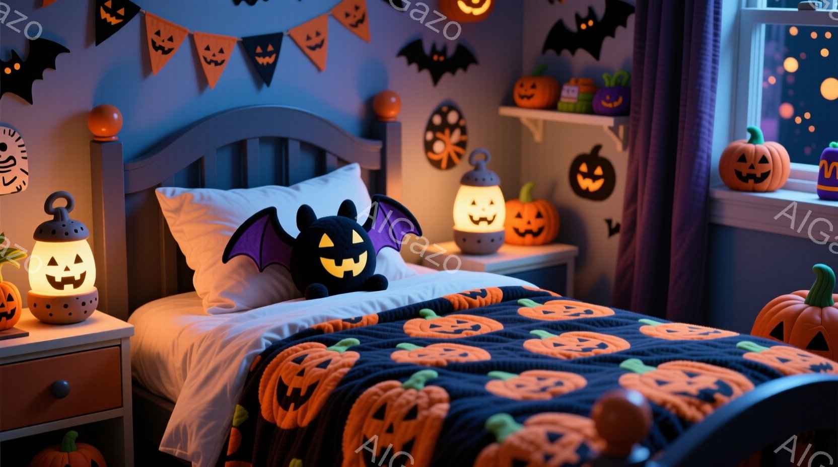 ハロウィーンの装飾が施された寝室で、ベッドの上には黒いコウモリのぬいぐるみが置かれています。ベッドサイドテーブルには、オレンジ色の光を放つハロウィーンのランタンが2つ置かれ、壁にはコウモリやカボチャのシルエットが飾られています。全体的に、暖かく、お祝いの雰囲気が漂う、子供らしい寝室の様子が描かれています。