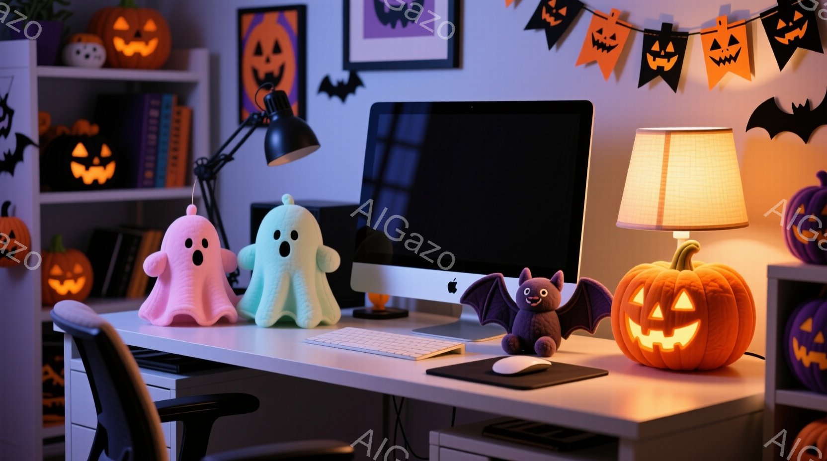 ハロウィーンをテーマにしたテーブルセッティングで、オレンジ色のジャック・オー・ランタンが中央に置かれています。可愛らしいお化けの形の布や、ハロウィーンを象徴するクッキー、カップなどがテーブルを彩り、お祝いの雰囲気を演出しています。背景にはハロウィーンのガーランドや、ぼんやりとした光があり、全体的に温かみのある、楽しいハロウィーンのパーティーの準備が整っている様子を表しています。