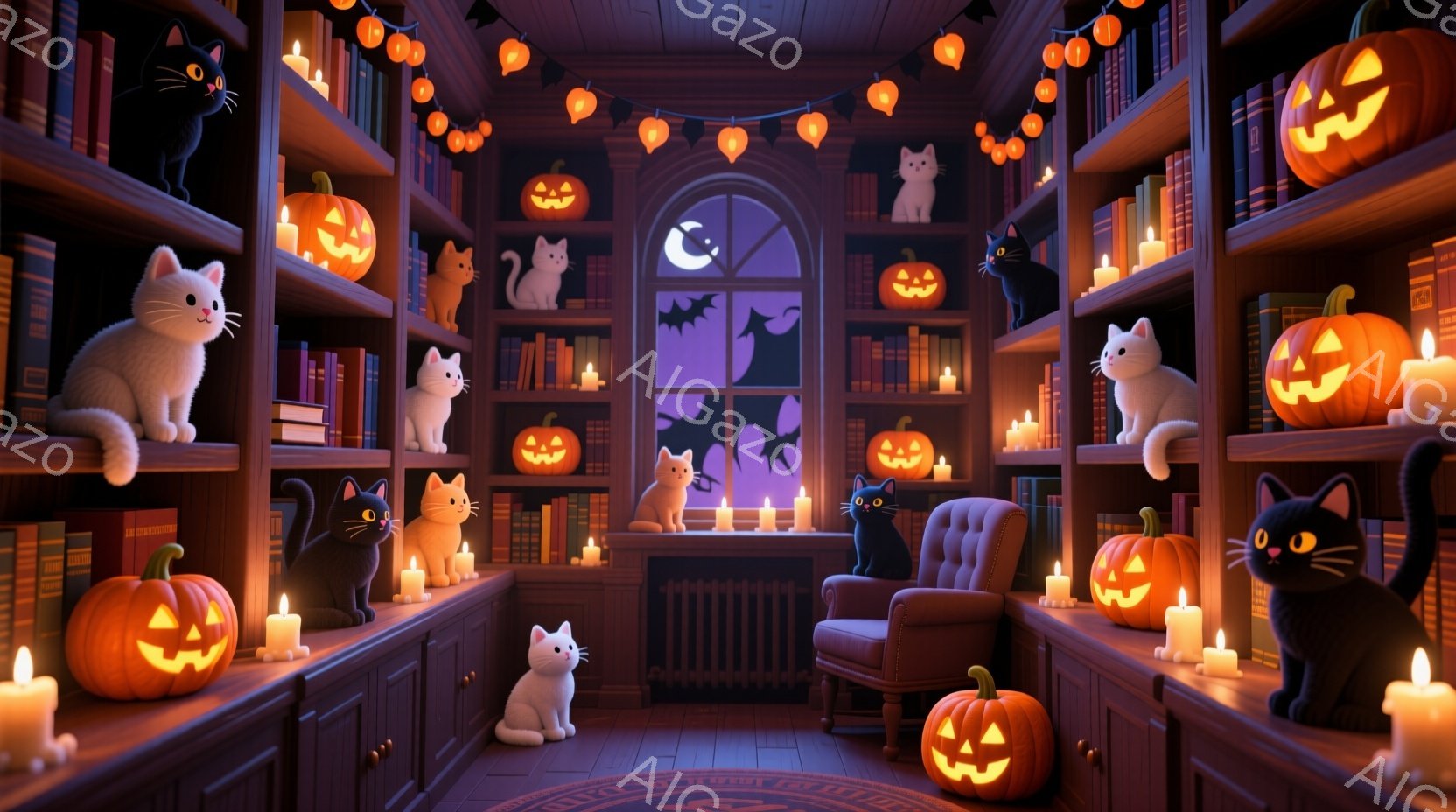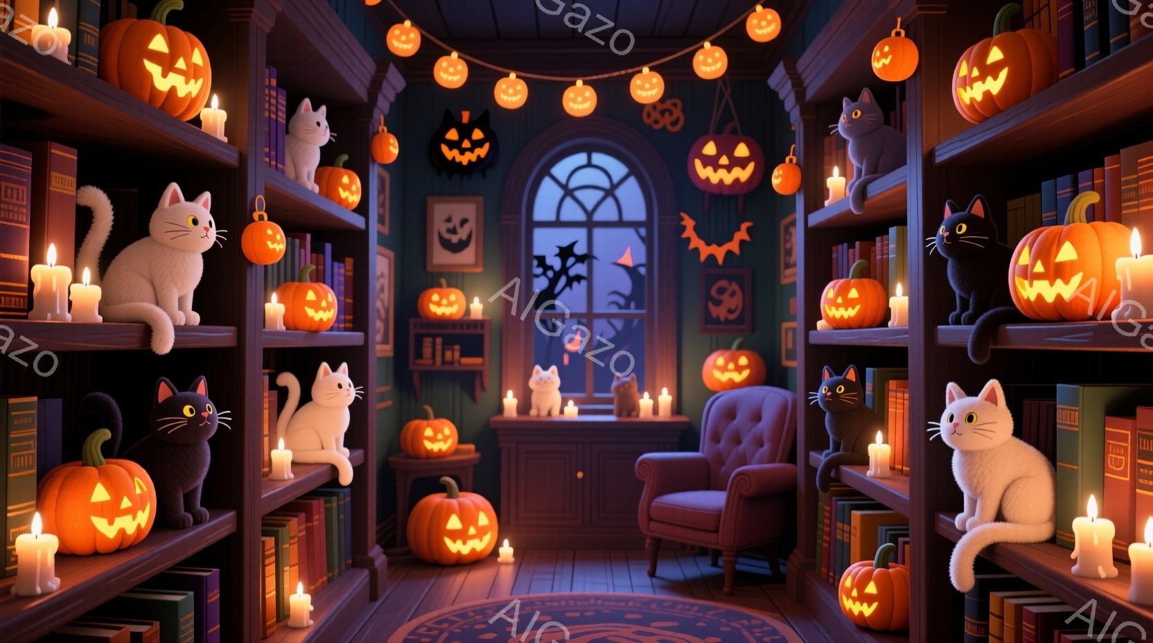 暖炉のない居間に、オレンジ色のハロウィーンの装飾が至る所に散りばめられています。棚にはカボチャやロウソクが並び、床には丸いカーペットが敷かれ、紫色の椅子が置かれています。黒猫や白猫が、カボチャと共に居間を飾り、外には暗い夜空と建物のシルエットが見えます。