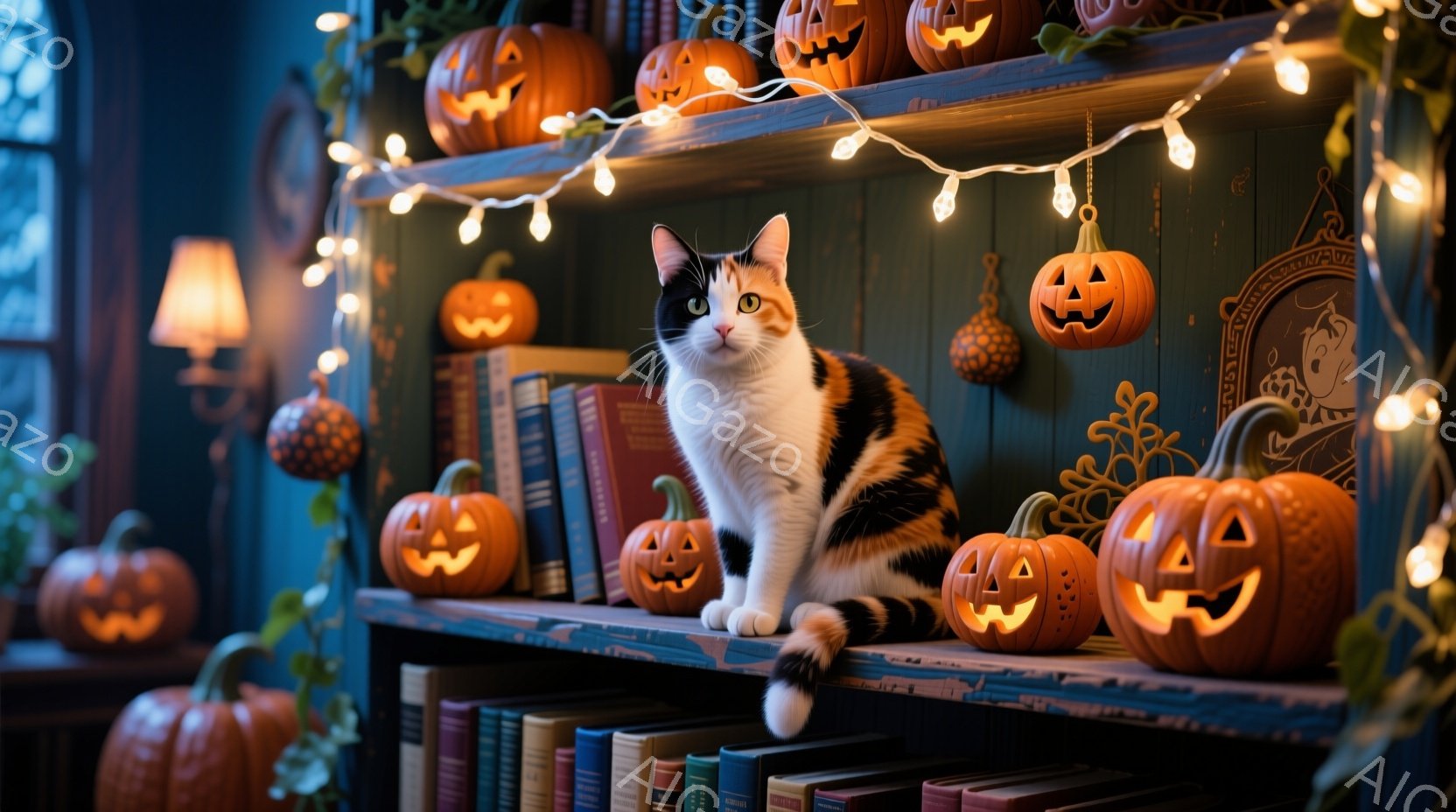 鮮やかなオレンジ色のハロウィンカボチャが所狭しと並んだ本棚に、三毛猫が落ち着いた様子で座っています。猫は正面を向き、わずかに微笑んでいるようで、周囲の装飾と調和した穏やかな雰囲気を醸し出しています。背景は深い緑色で、カボチャのオレンジ色がより一層引き立ち、全体的に温かく幻想的な秋の情景が広がっています。