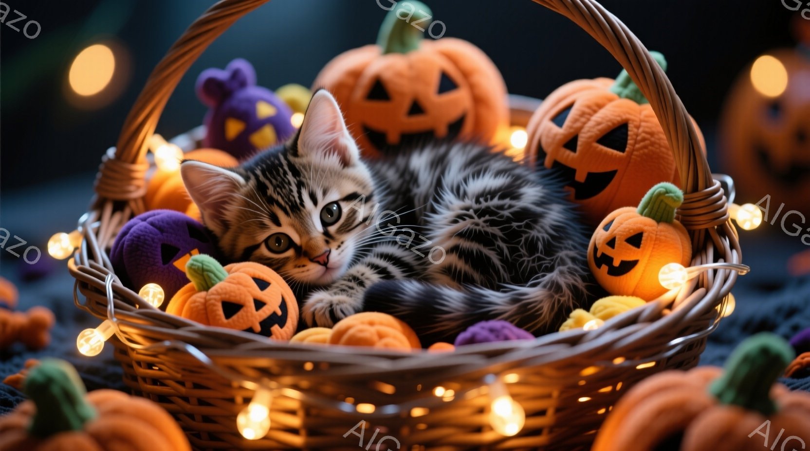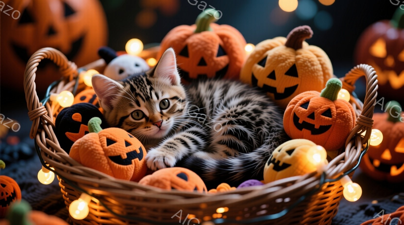 籠の中に、縞模様の小さな子猫が丸まって眠っています。周りにはハロウィーンの飾りであるオレンジ色のカボチャのぬいぐるみがたくさん置かれ、暖かい電飾が飾られています。背景にはさらにカボチャの飾りがぼんやりと見え、全体的に温かく、可愛らしいハロウィーンの雰囲気を醸し出しています。
