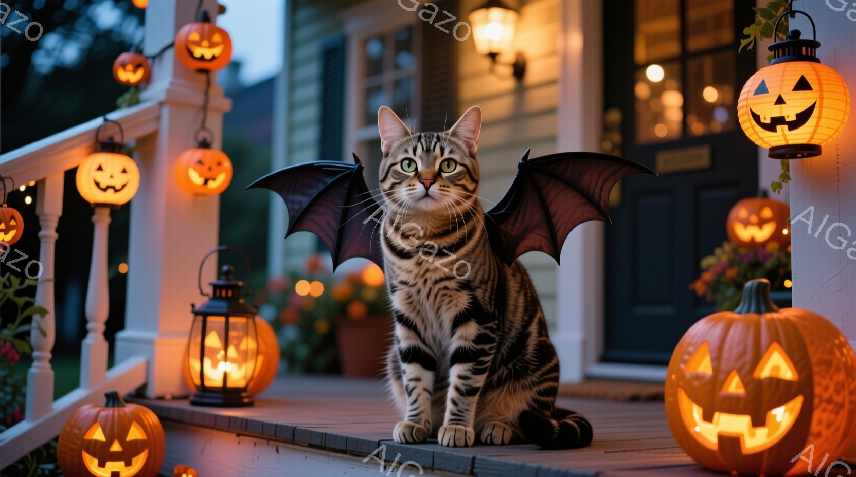 この無料AI生成画像「ハロウィーンの装飾が施された背景に、骨の模様のコスチュームを着た2匹の猫がオレンジ色の毛布の上に横たわっています。猫たちはそれぞれ異なる毛並みで、片方は白黒、もう片方は茶色と白の模様で、落ち着いた表情でカメラを見つめています。背景には大きなジャック・オ・ランタンといくつかのライトが配置され、秋らしい温かく楽しい雰囲気を醸し出しています。」は、2025年10月24日に作成されました。 サイズは 1664×928px の高解像度で、商用利用も可能なフリー素材として提供しています。