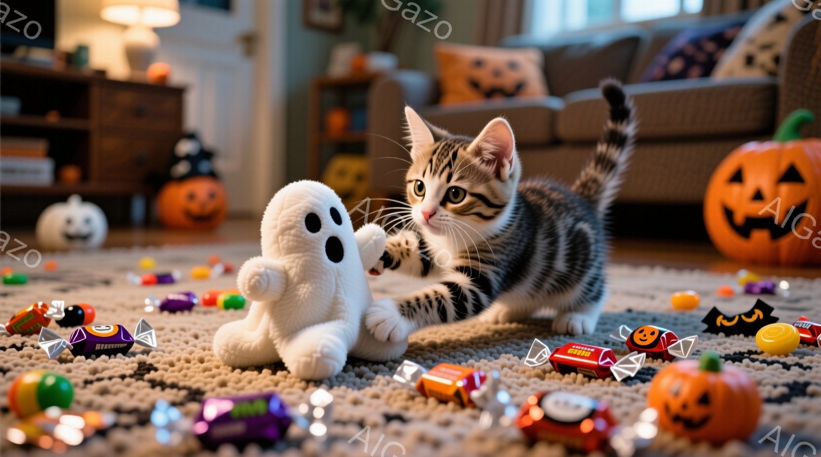 縞模様の子猫が白いお化けのぬいぐるみに前足でちょんとしている様子が写っている。周りにはハロウィーンのキャンディーや小さなカボチャが散らばっており、カーペットの上に置かれている。背景にはソファや棚が見え、室内でハロウィーンの飾り付けがされている暖かい雰囲気の画像である。